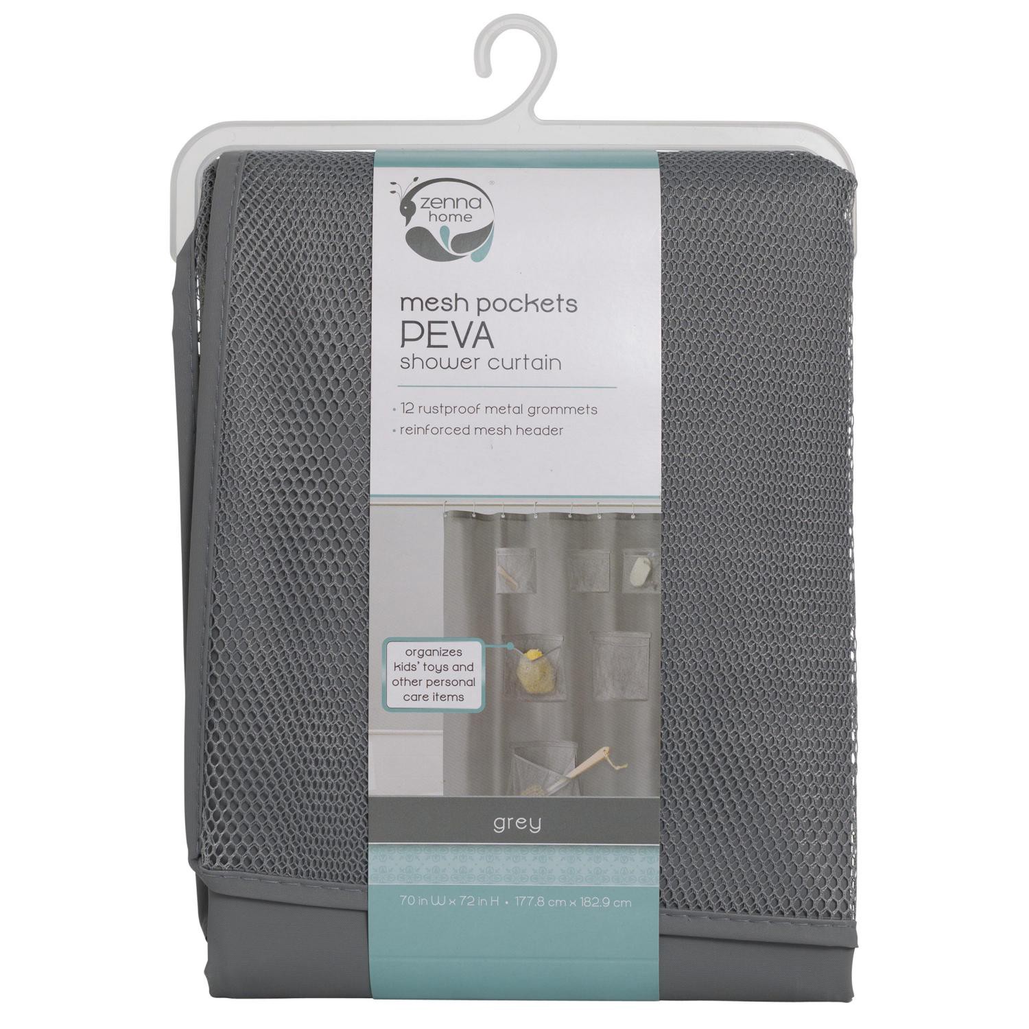 Zenna Home Mesh Pockets PEVA Shower Curtain and Organizer, 70 in x 72 in, Grey
