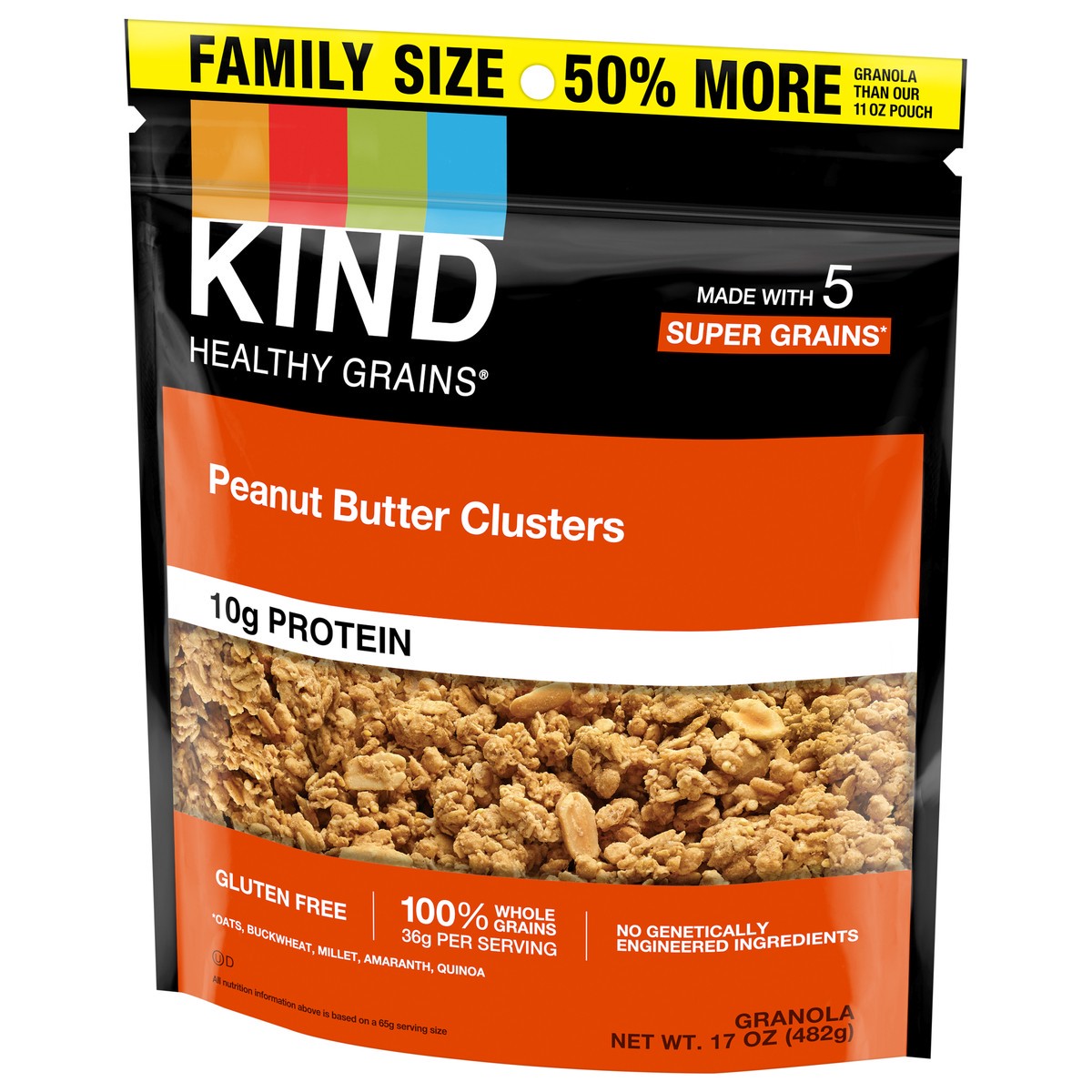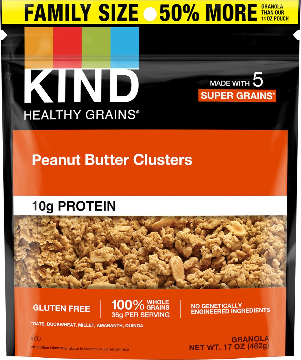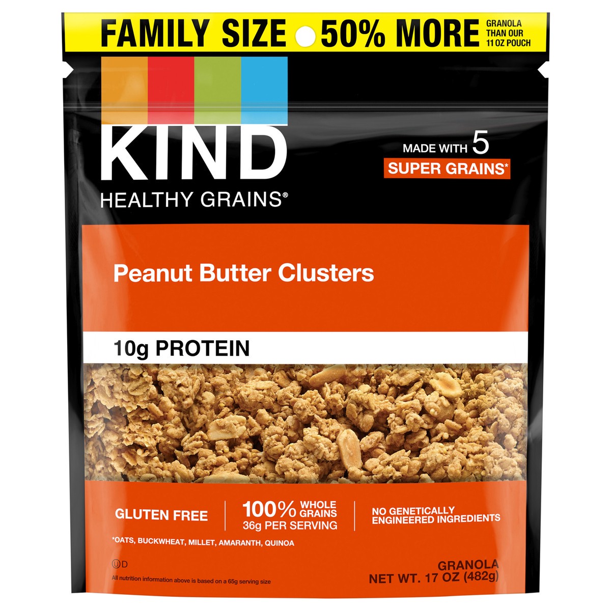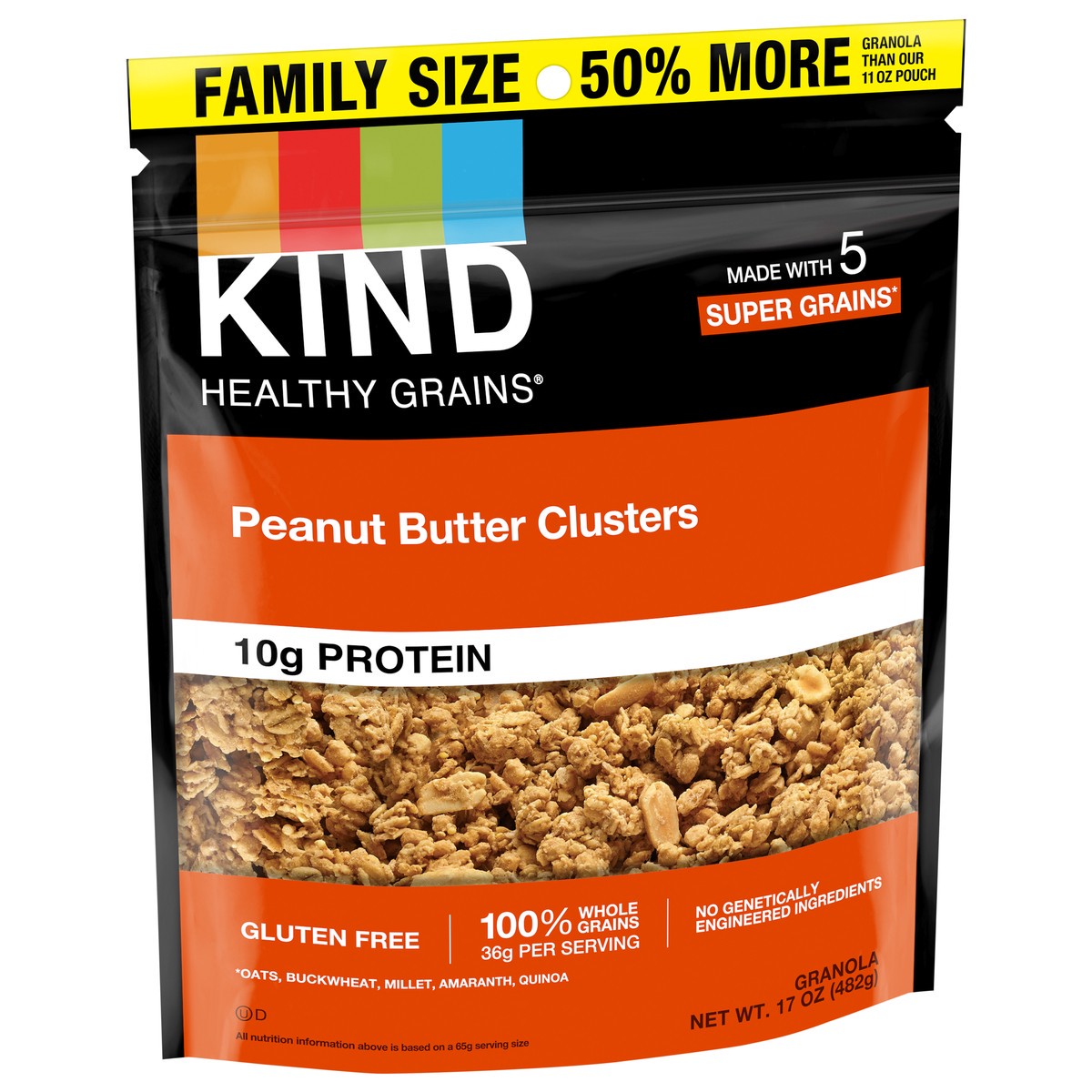 KIND HEALTHY GRAINS Peanut Butter Whole Grain granola clusters are an all-in-one, convenient, hand-to-mouth healthy snack mix. These wholesome clusters have 10 grams of protein and 34 grams of whole g…