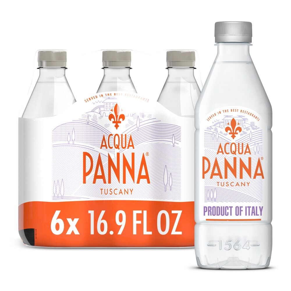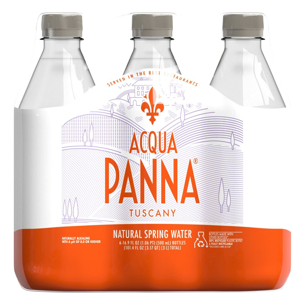 - Six 16.9 fl oz/500mL plastic bottles of Acqua Panna Natural Spring Water