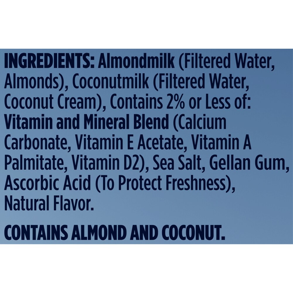 Almondmilk (Filtered Water, Almonds), Coconutmilk (Filtered Water, Coconut Cream), Contains 2% or Less of: Vitamin and Mineral Blend (Calcium Carbonate, Vitamin E Acetate, Vitamin A Palmitate, Vitamin…