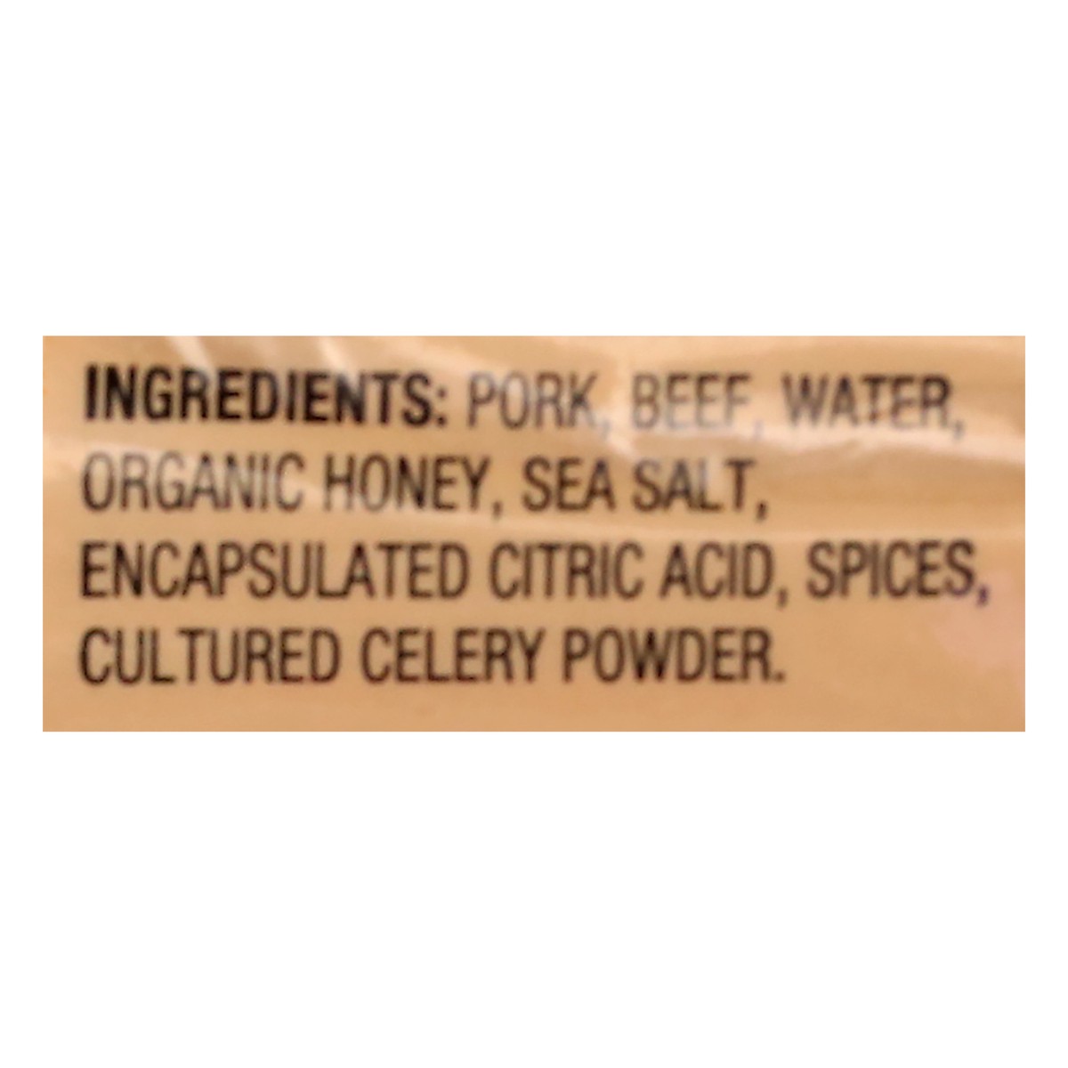Pork, Beef, Water, Organic Honey, Sea Salt, Encapsulated Citric Acid, Spices, Cultured Celery Powder.