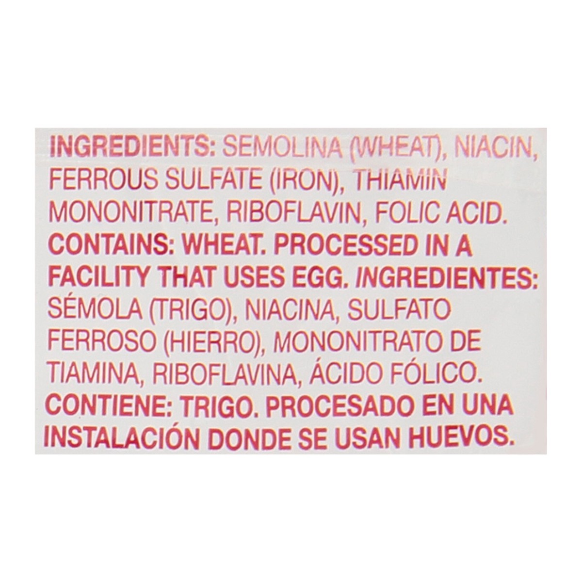 Semolina (Wheat), Niacin, Ferrous Sulfate (Iron), Thiamin Mononitrate, Riboflavin, Folic Acid.