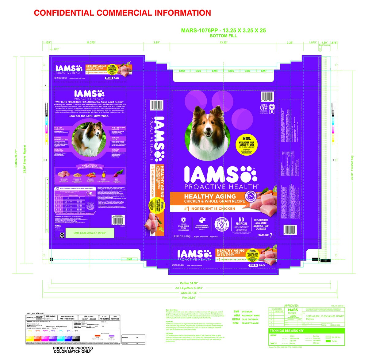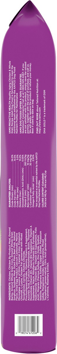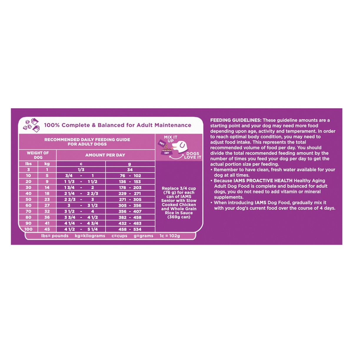 Calorie Content (Calculated): 3428 kcal ME/kg, 349 kcal ME/cup. IAMS Proactive Health Healthy Aging Chicken & Whole Grain Recipe Adult Dog Food is formulated to meet the nutritional levels established…