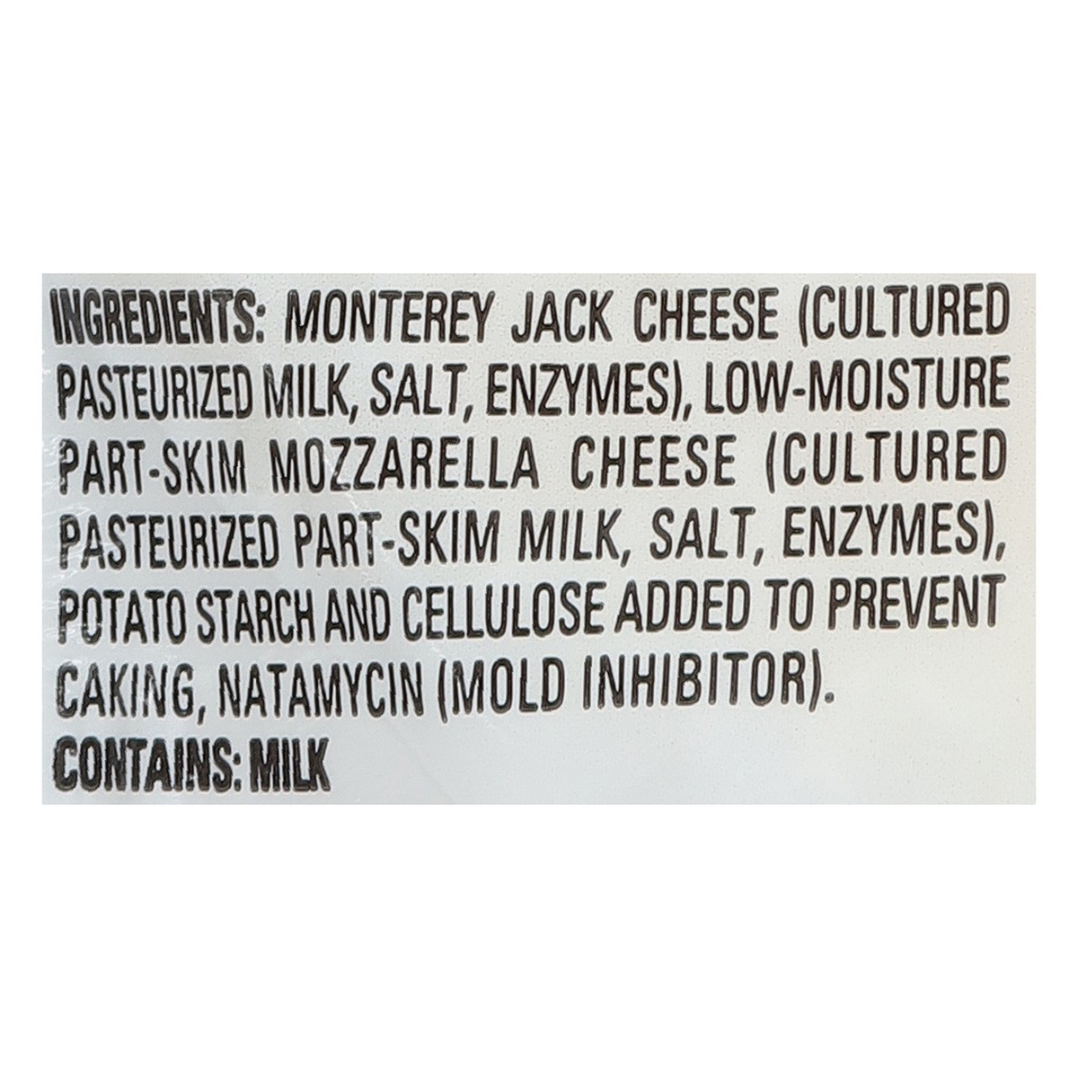 Monterey Jack Cheese (Cultured Pasteurized Milk, Salt, Enzymes), Low-Moisture Part-Skim Mozzarella Cheese (Cultured Pasteurized Part-Skim Milk, Salt, Enzymes), Potato Starch and Cellulose Added to Pre…