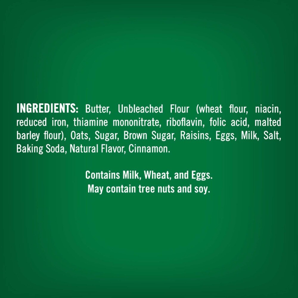 INGREDIENTS: Butter, Unbleached flour (wheat flour, niacin, reduced iron, thiamine mononitrate, riboflavin, folic acid, malted barley flour), Oats, Sugar, Brown Sugar, Raisins, Eggs, Milk, Salt, Bakin…