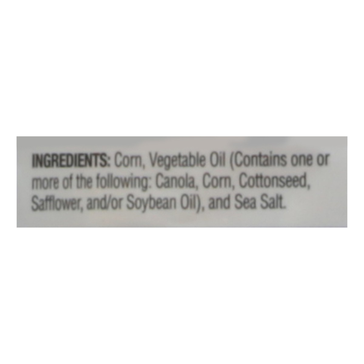Corn, Vegetable Oil (Contains One or More of the Following: Canola, Corn, Cottonseed, Safflower, and/or Cottonseed Oil), and Sea Salt.