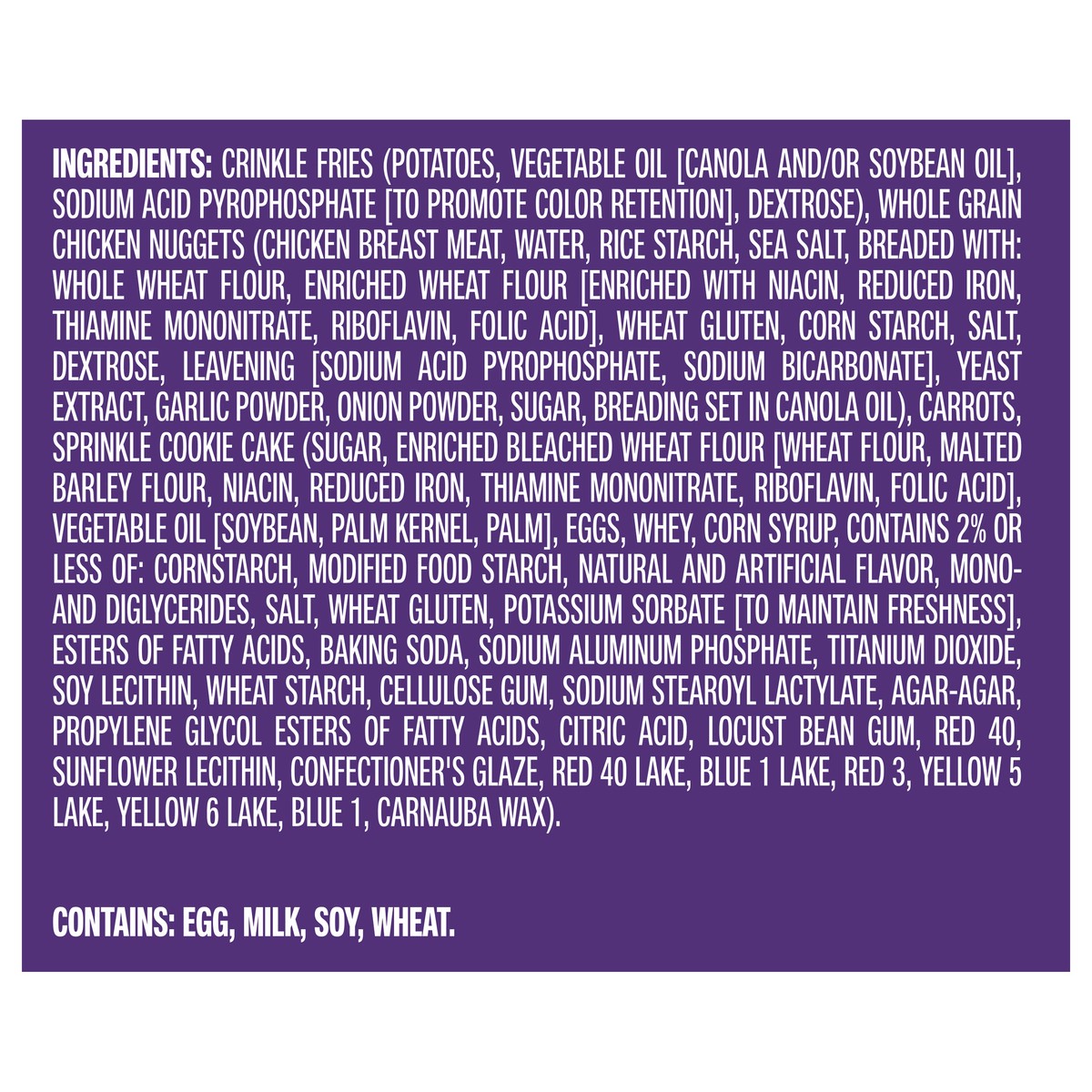 French Fries (Potatoes, Vegetable Oil (Canola Oil, Sunflower Oil, Cottonseed Oil), Distilled Vinegar, Salt), Whole Grain Chicken Nuggets (Chicken Breast Meat, Water, Rice Starch, Sea Salt, Breaded wit…