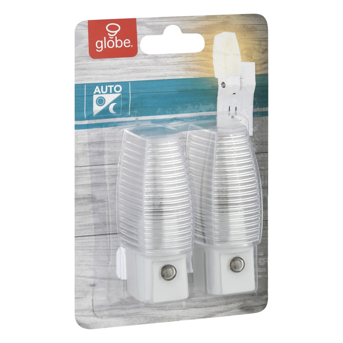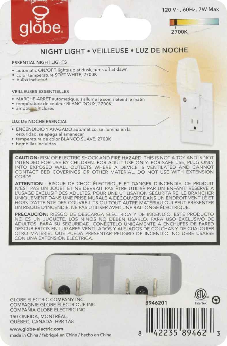120 V, 60 Hz, 7 W Max. 2700K. Automatic on/off, lights up at dusk, turns off at dawn. Color temperature soft white, Bulbs included. ETL listed - Intertek. www.globe-electric.com. Made in China.
