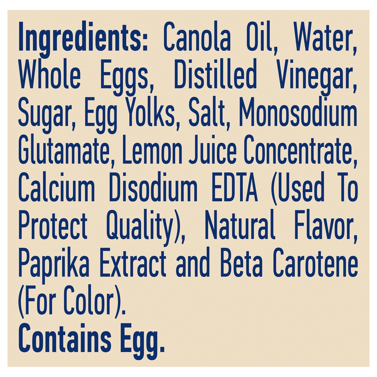 Ingredients: Canola Oil, Water, Whole Eggs, Distilled Vinegar, Sugar, Egg Yolks, Salt, Monosodium Glutamate, Lemon Juice Concentrate, Calcium Disodium EDTA (Used To Protect Quality), Natural Flavor, P…