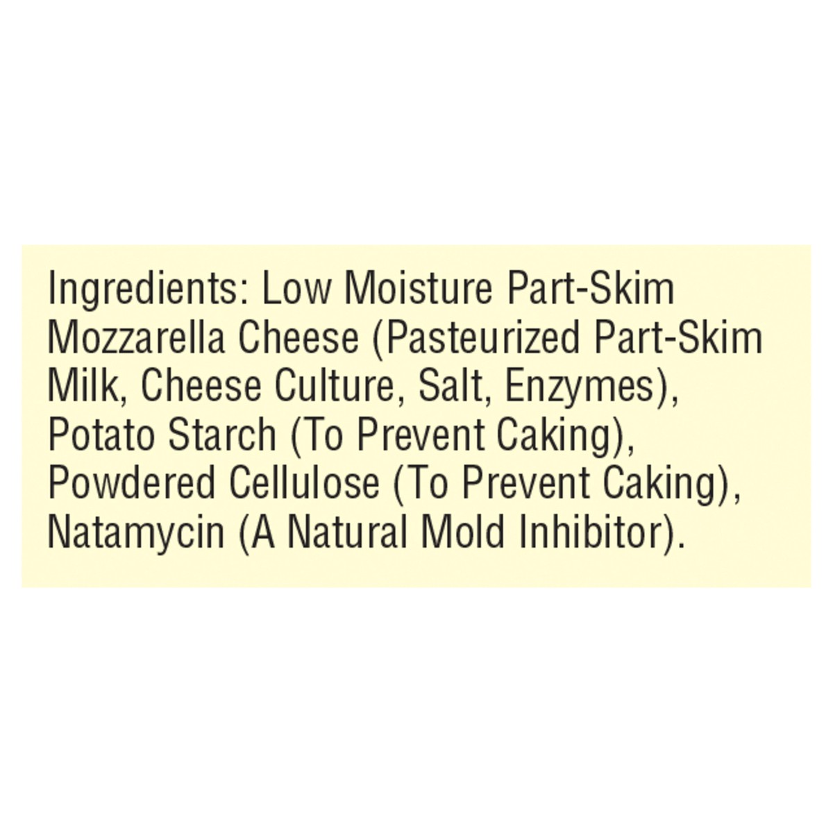 Low Moisture Part-Skim Mozzarella Cheese (Pasteurized Part-Skim Milk, Cheese Culture, Salt, Enzymes), Potato Starch (To Prevent Caking), Powdered Cellulose (To Prevent Caking), Natamycin (A Natural Mo…
