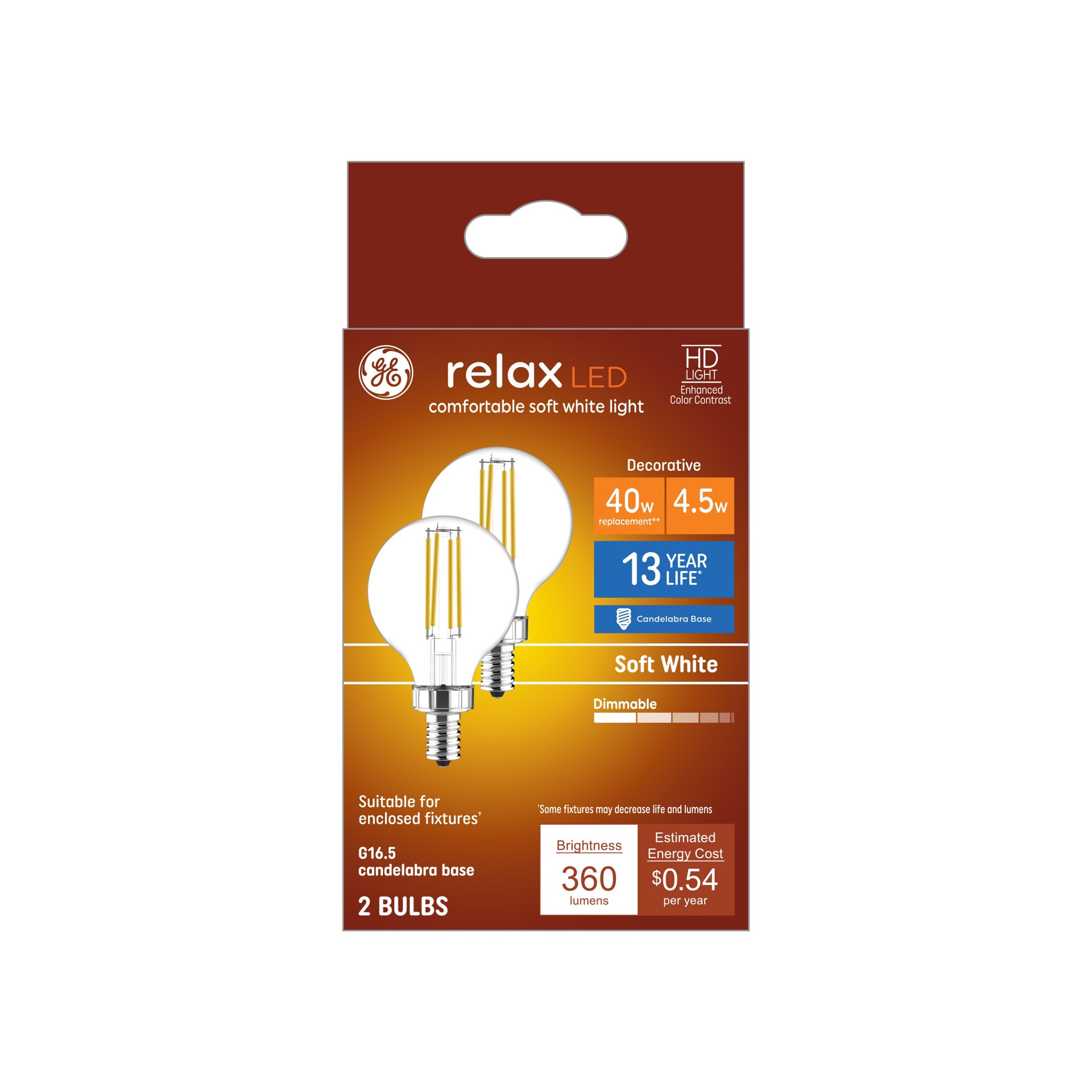 GE Relax HD 40 -Watt EQ G16.5 Soft white Candelabra screw base E12 Dimmable LED Decorative Light Bulb 2 -Pack