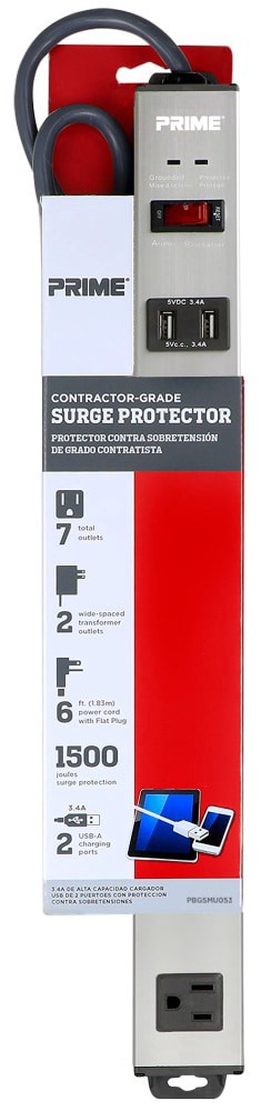 7 Total Outlets 2 Wide-Spaced Transformer Outlets 6 Ft Power Cord with Flat Plug 1500 Joules Surge Protection