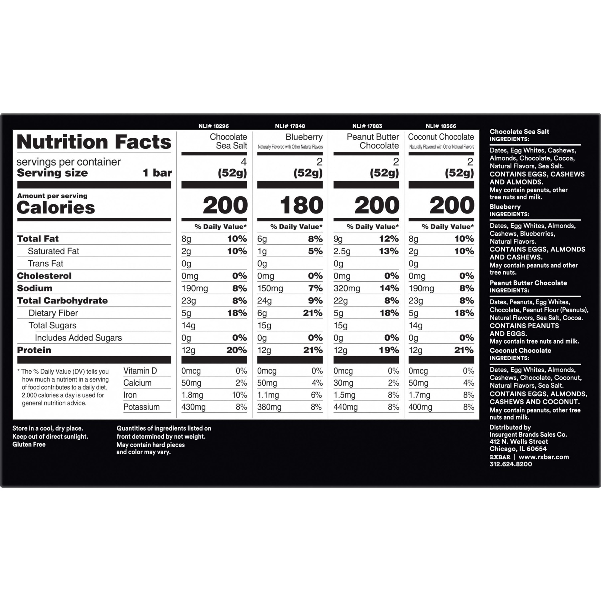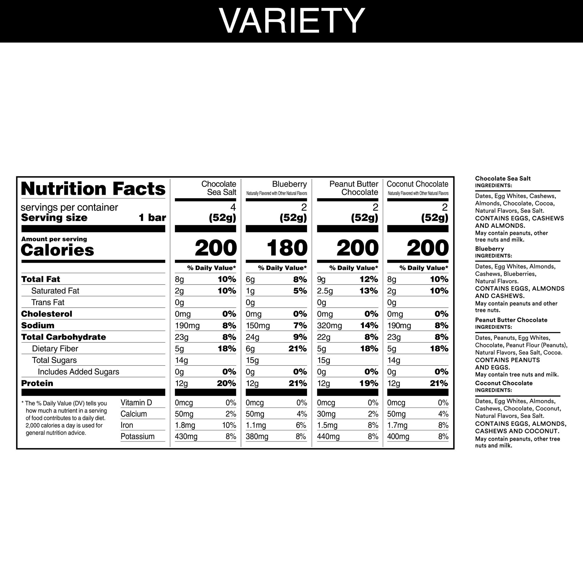 Chocolate Sea Salt: Dates, Egg Whites, Cashews, Almonds, Chocolate, Cocoa, Natural Flavors, Sea Salt. Blueberry: Dates, Egg Whites, Almonds, Cashews, Blueberries, Natural Flavors. Peanut Butter Chocol…