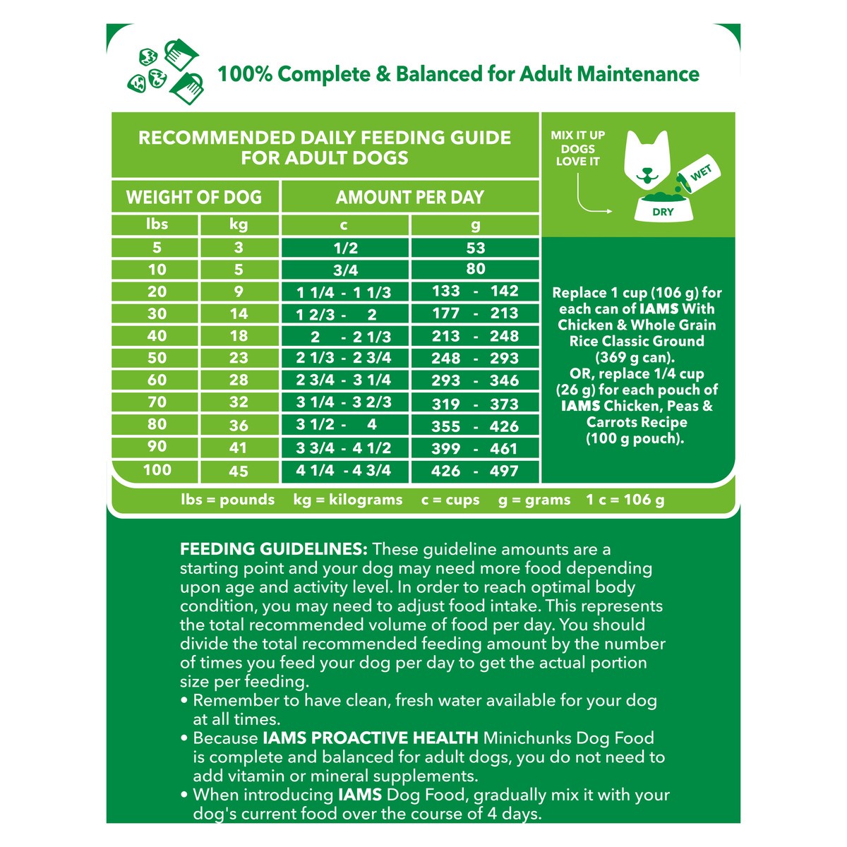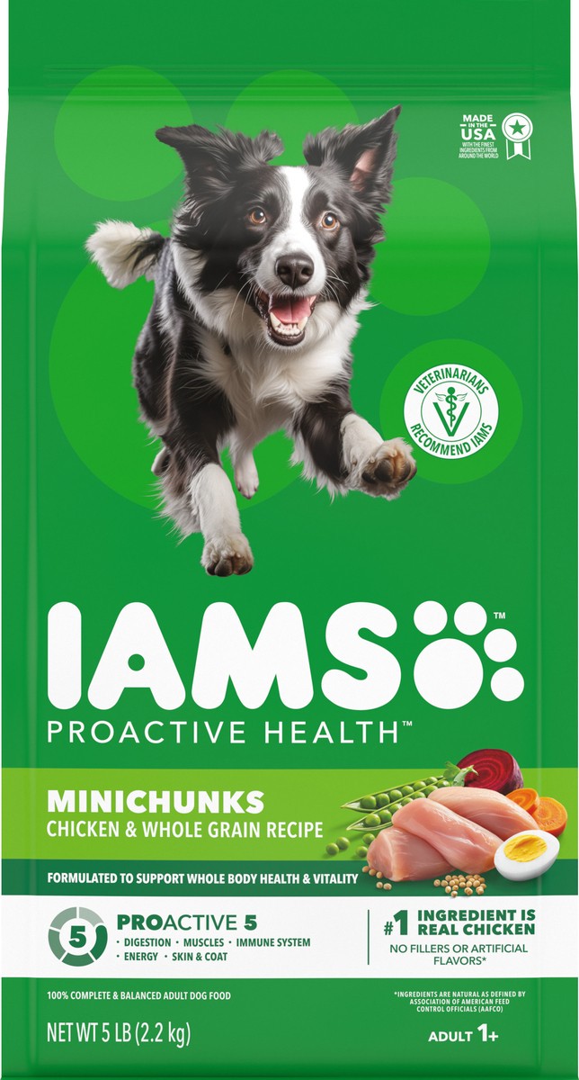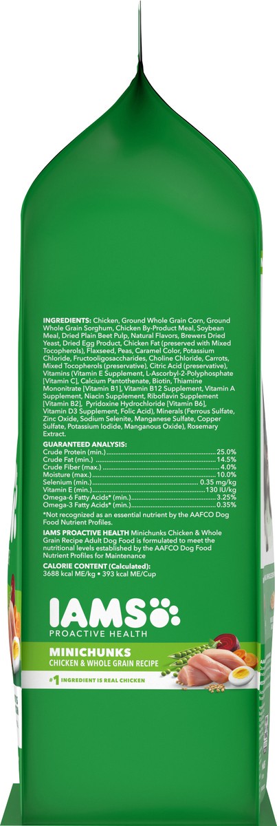 Calorie Content (Calculated): 3688 Kcal ME/kg 393 Kcal ME/Cup. IAMS Proactive Health Minichunks Chicken & Whole Grain Recipe Adult Dog Food is formulated to meet the nutritional levels established by …