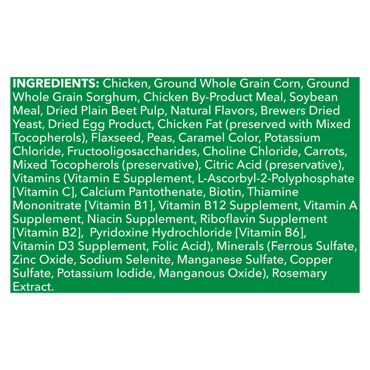 Chicken, Ground Whole Grain Corn, Ground Whole Grain Sorghum, Chicken By-Product Meal, Soybean Meal, Dried Plain Beet Pulp, Natural Flavors, Brewers Dried Yeast, Dried Egg Product, Chicken Fat (Preser…