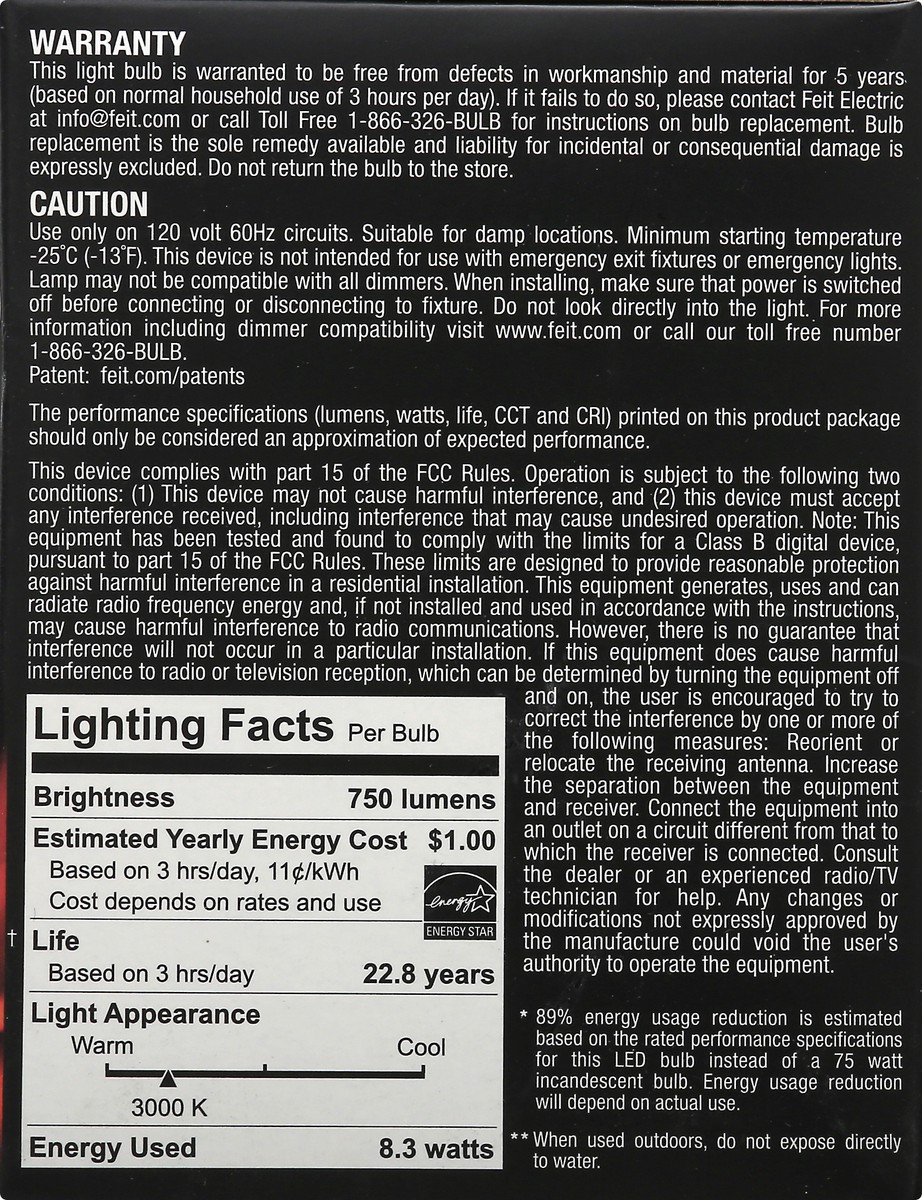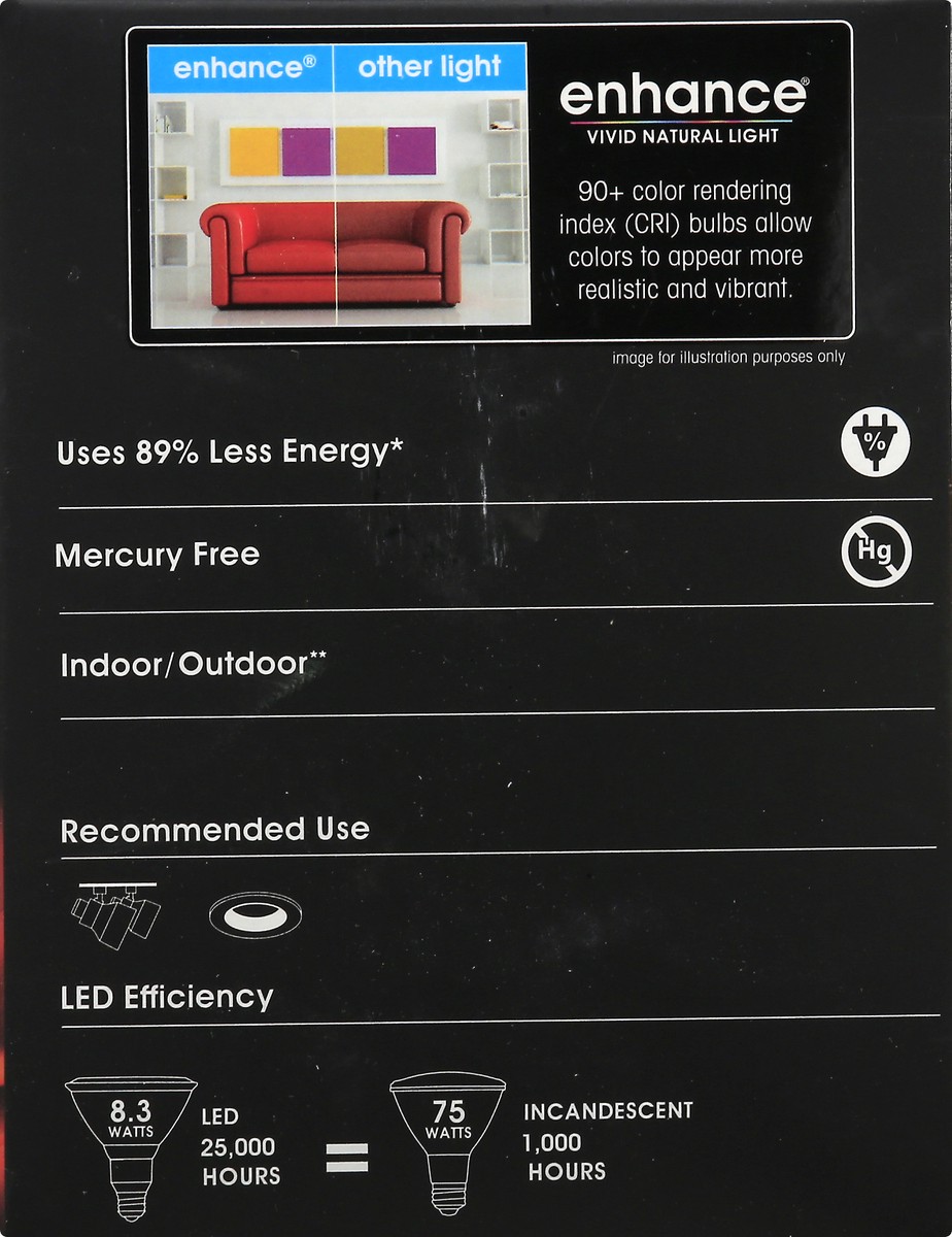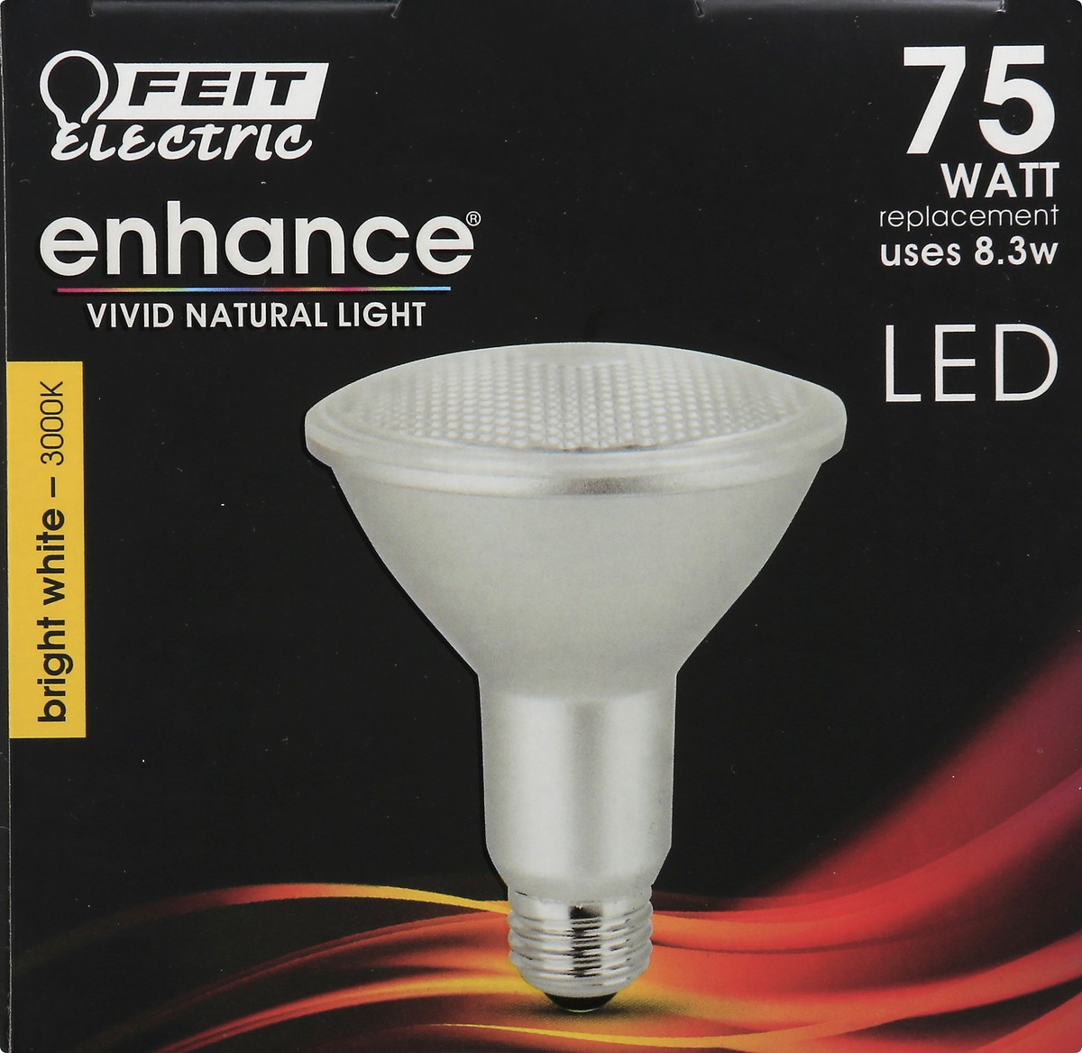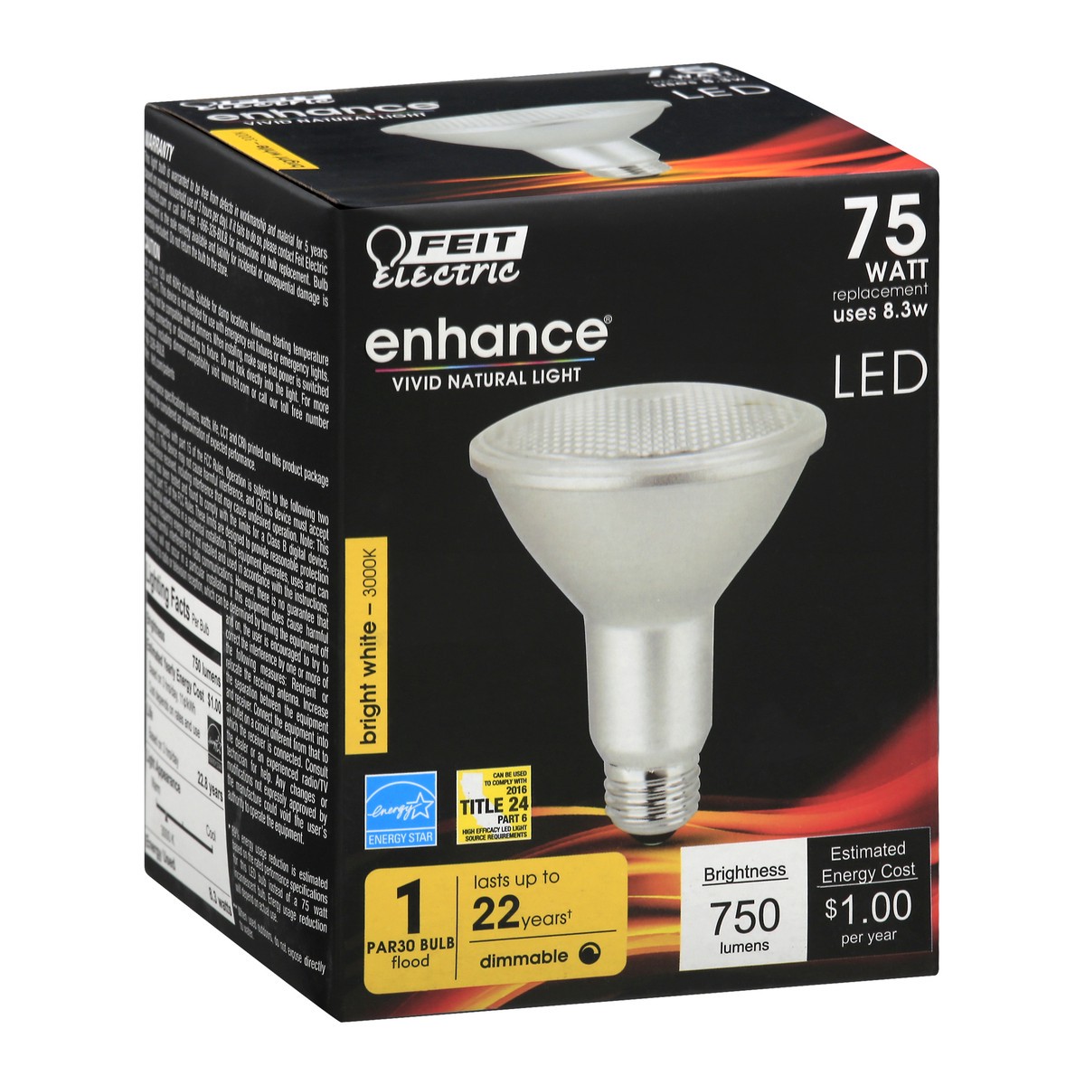 1 PAR30 bulb flood. 75 watt replacement uses 8.3 w. Vivid natural light. Bright white - 3000 k. Lasts up to 22 years (Based on 3 hrs/day). Dimmable. Brightness: 750 lumens. Estimated Energy Cost: $1.0…