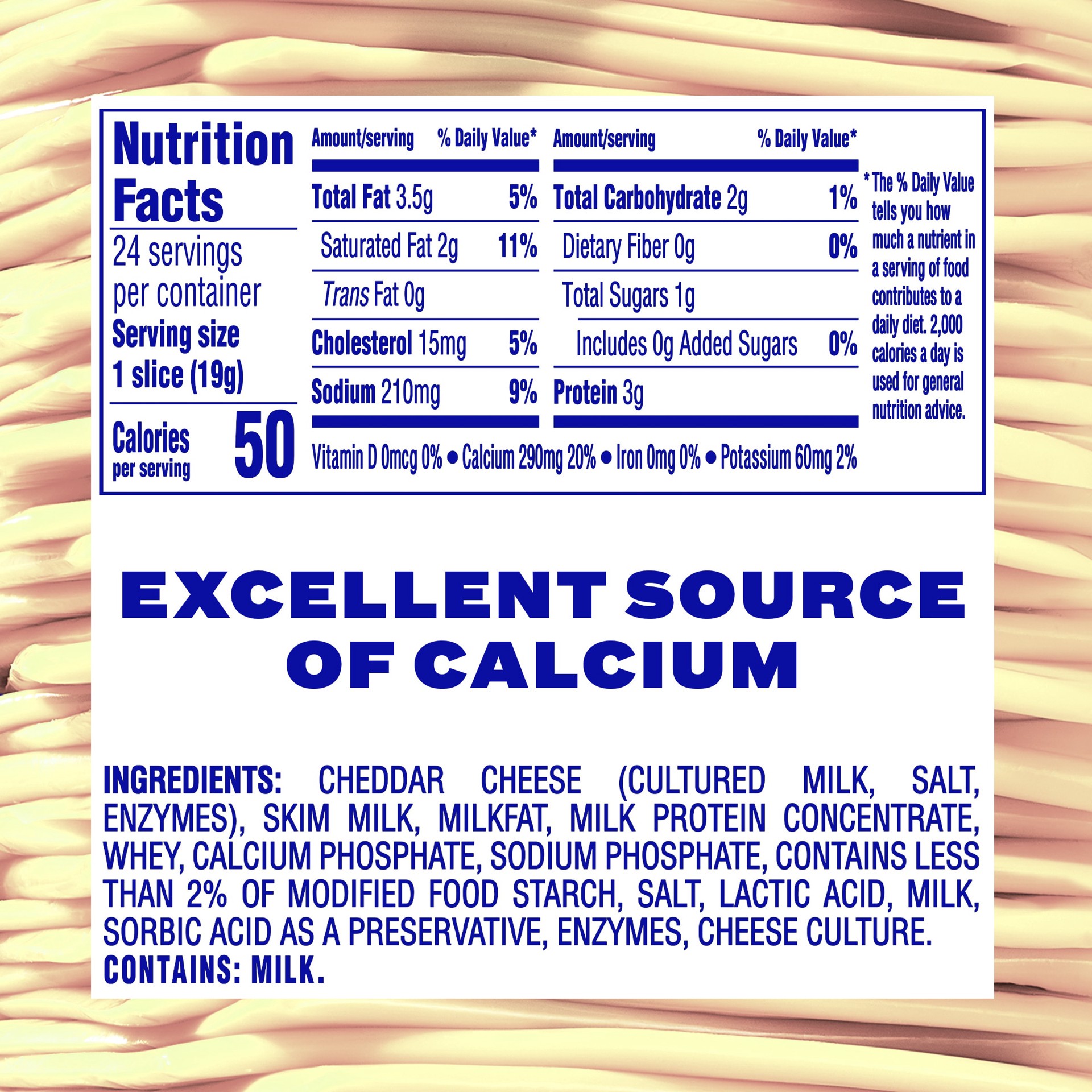 CHEDDAR CHEESE (CULTURED MILK, SALT, ENZYMES), SKIM MILK, WHEY, MILKFAT, MILK PROTEIN CONCENTRATE, CALCIUM PHOSPHATE, SODIUM PHOSPHATE, CONTAINS LESS THAN 2% OF MODIFIED FOOD STARCH, SALT, MILK, LACTI…