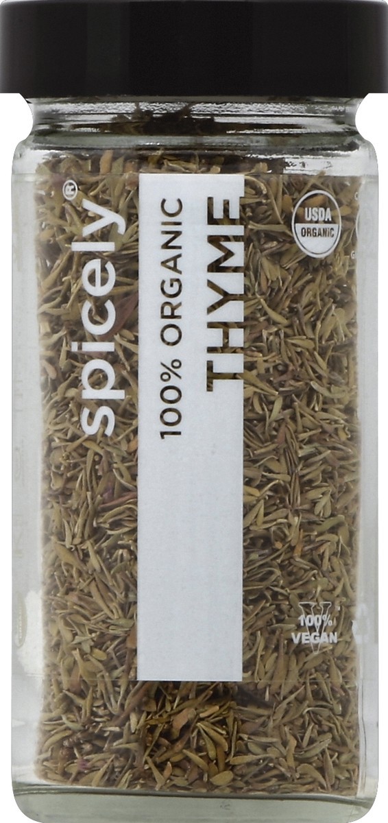USDA organic. 100% vegan. Thyme's fragrant and herbal leaves pair well with meats and vegetables. www.spicely.com. Certified organic by Global Culture. No gluten. No MSG. No artificial coloring. No pr…