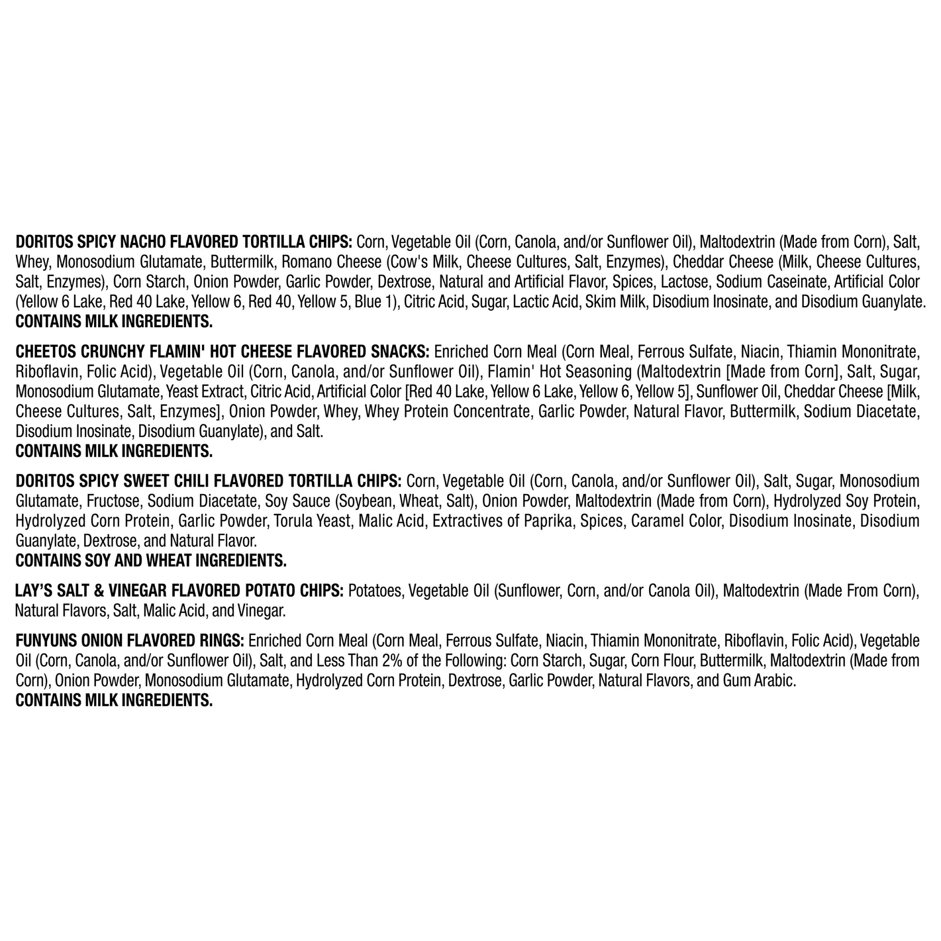Cheetos crunchy flamin' hot cheese flavored snacks: contains milk ingredients. doritos spicy nacho flavored tortilla chips: contains milk ingredients. funyuns onions flavored rings: contains milk ingredients. doritos spicy sweet chili flavored tortilla chips: contains soy and wheat ingredients.