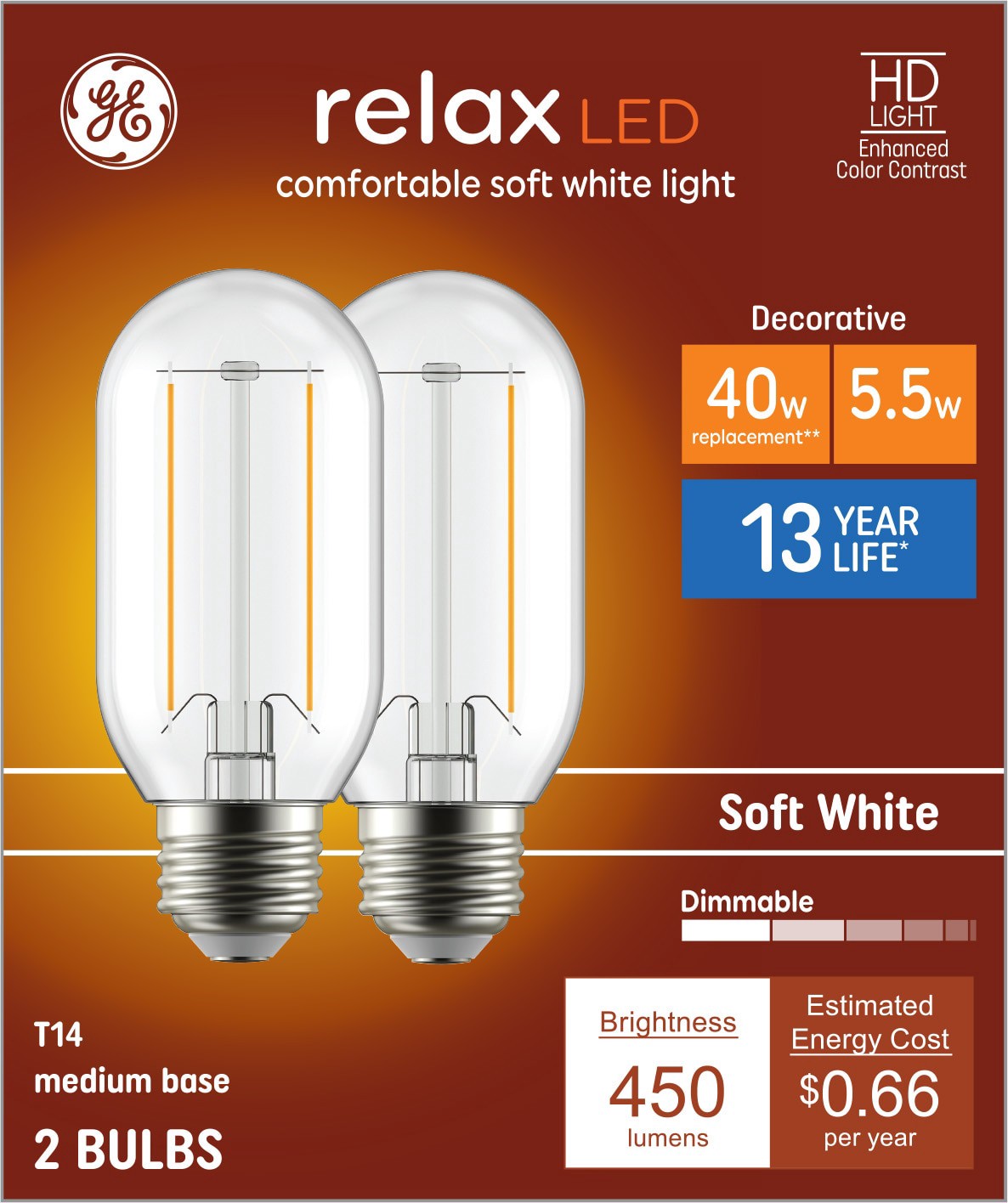 GE Relax HD 40 -Watt EQ T14 Soft white Medium screw base E26 Dimmable LED Decorative Light Bulb 2 -Pack