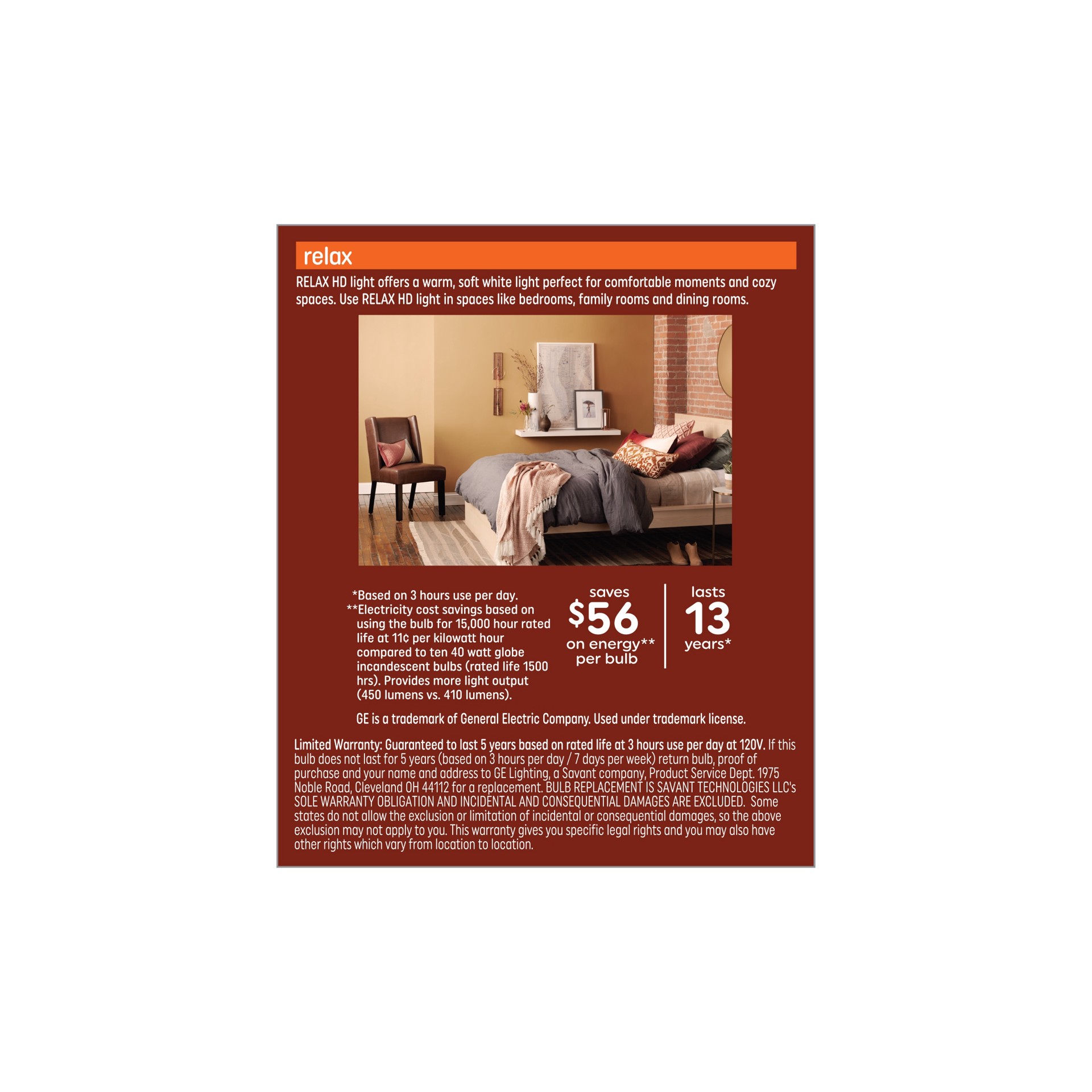 40 Watt replacement using only 5.5 Watts (450 lumens). Rated to last 13 years based on 3 hours per day use. Saves 56 dollars on energy costs per bulb versus 40-Watt incandescent over the bulb's life. …