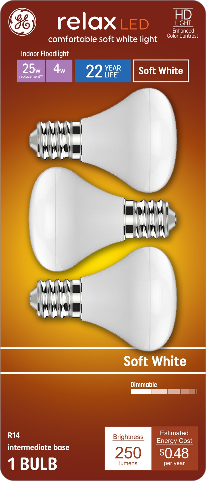 25 Watt replacement using only 4 Watts (250 lumens). Rated to last 22 years based on 3 hours per day use. Saves 57 dollars on energy costs per bulb versus 25-Watt R14 incandescent over the bulb's lifeā¦