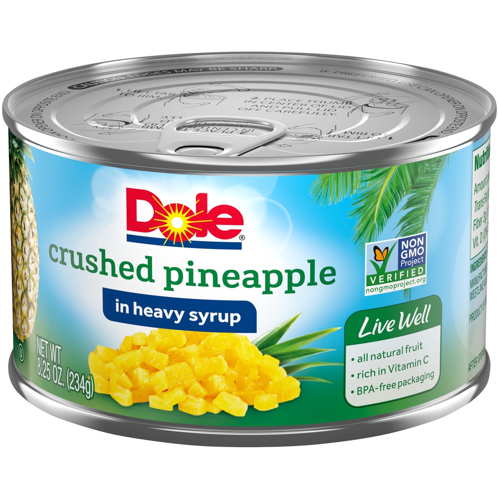 DOLE Crushed Pineapple in Heavy Syrup is rich in Vitamin C, and made from all natural fruit and non-GMO ingredients; It's naturally gluten free and Kosher, and great for recipes.