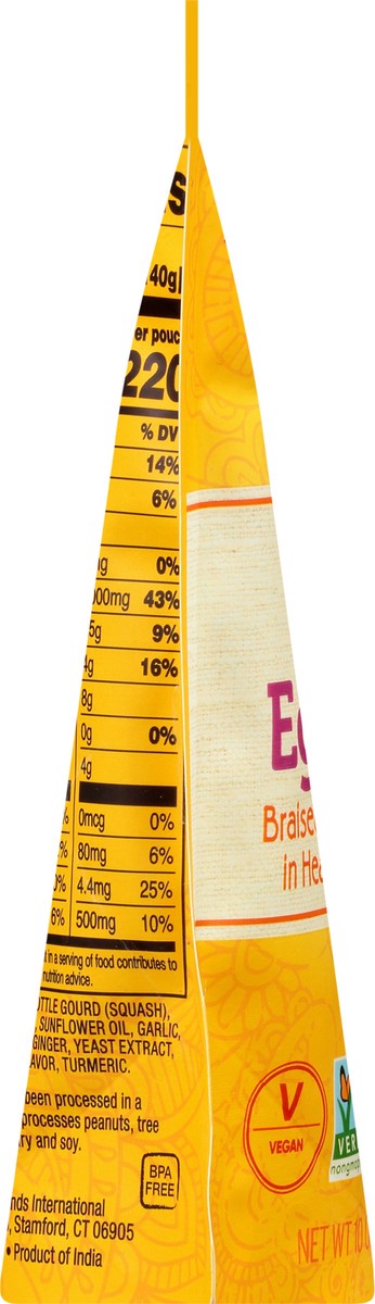 Eggplant, Onions, Bottle Gourd, Tomato Paste, Sunflower Oil, Garlic; Less than 2% of: Spices, Salt, Ginger, Yeast Extract (Yeast Extract, Salt), Cilantro, Natural Coriander Flavor.