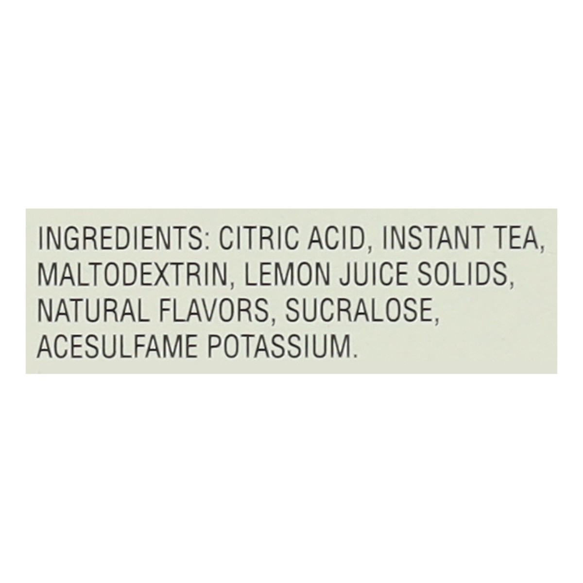 Citric Acid, Instant Tea, Maltodextrin, Lemon Juice Solids, Natural Flavors, Sucralose, Acesulfame Potassium.