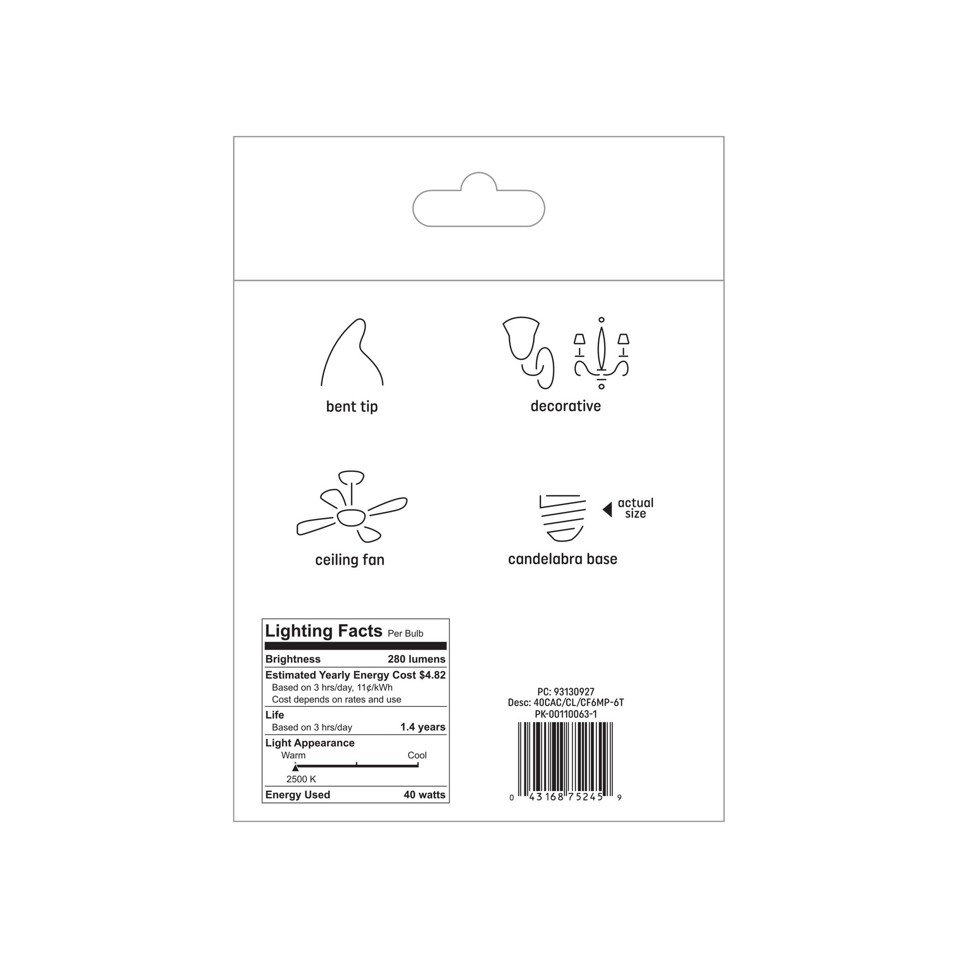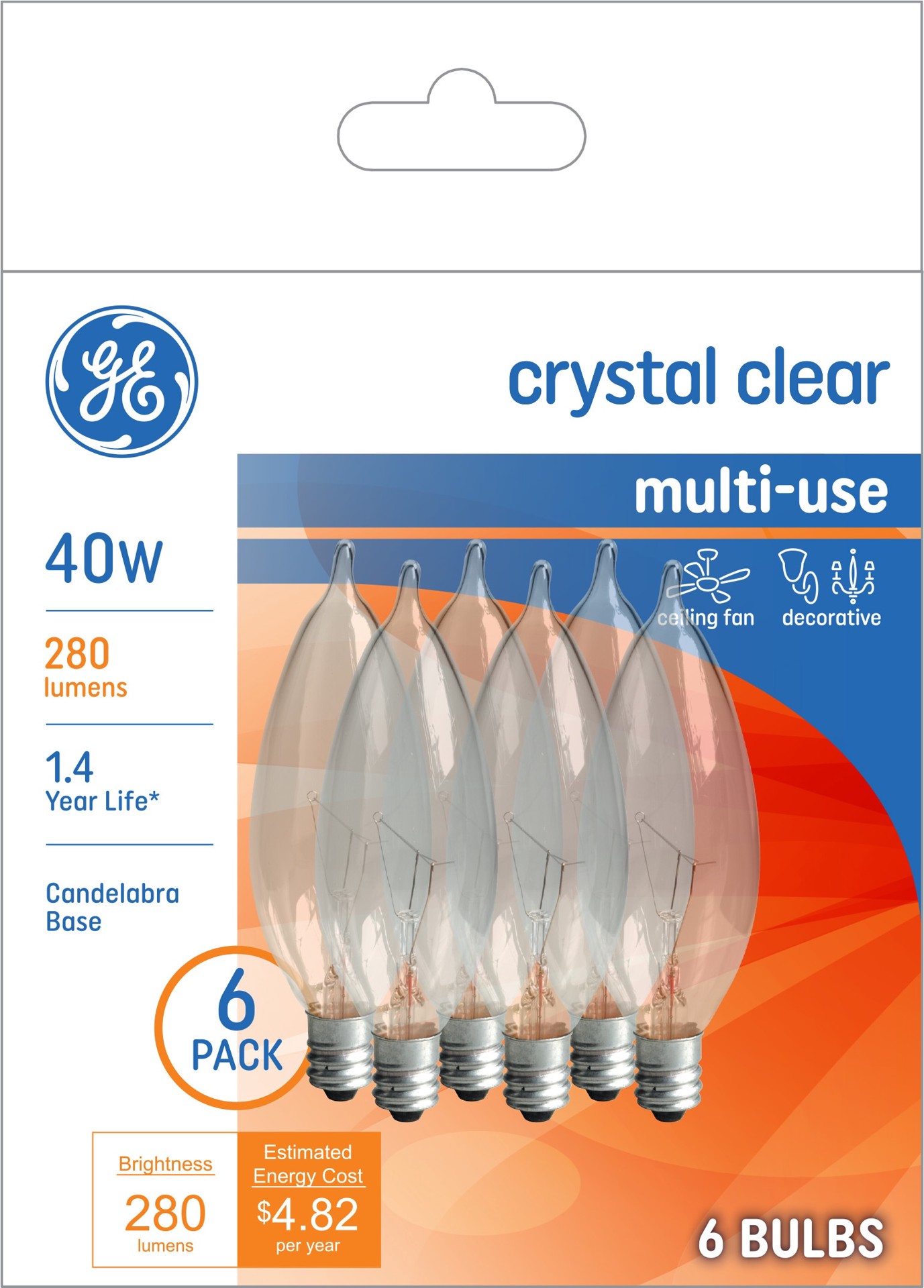 GE Classic 40 -Watt EQ CA10 Soft white Candelabra screw base E12 Dimmable Incandescent Decorative Light Bulb 6 -Pack