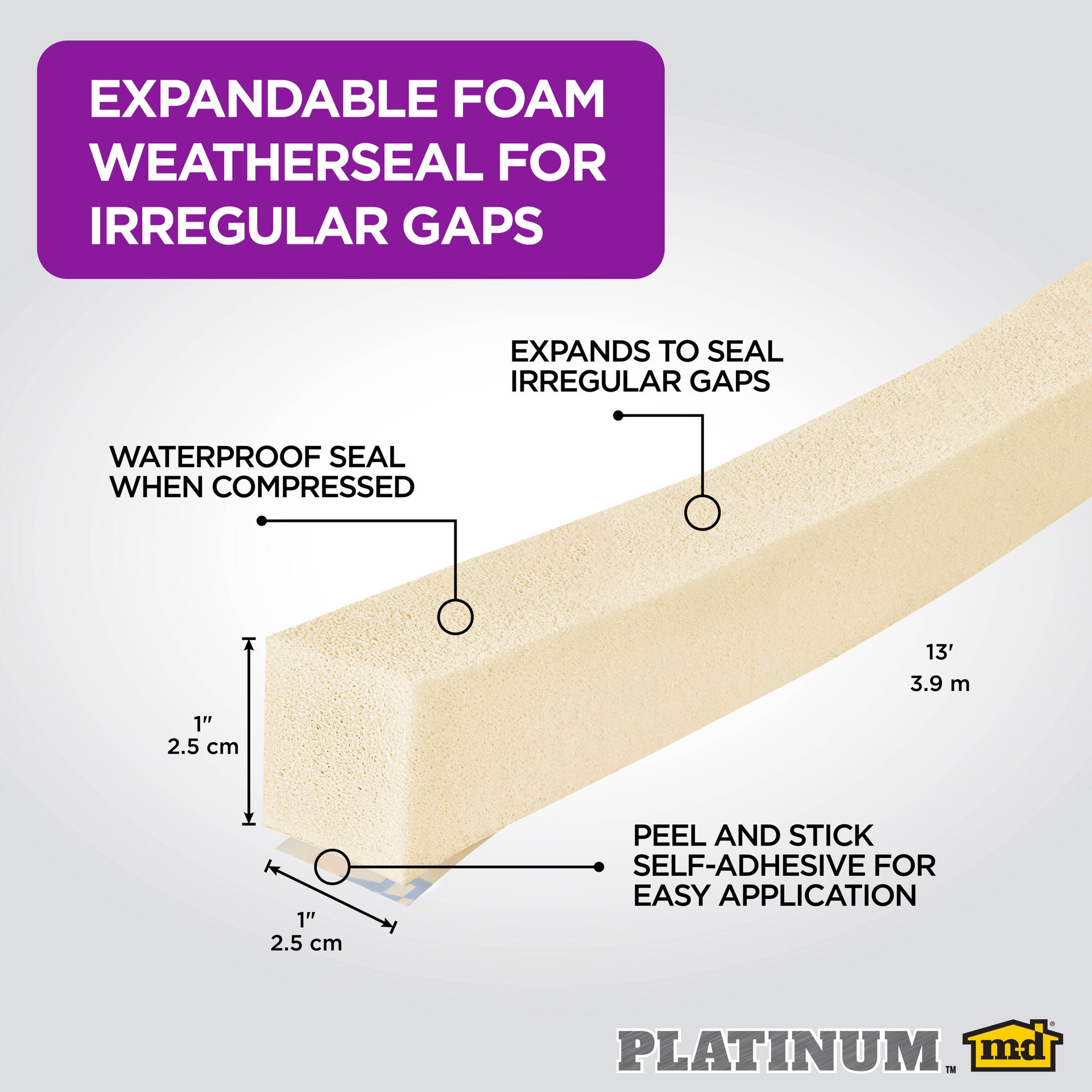 Made of open cell foam. Provides seal for uneven gaps. Watertight seal when 80% compressed. Neutral Color. Self-adhesive for easy application. Paintable. Indoor or outdoor use. Cut to desired length w…