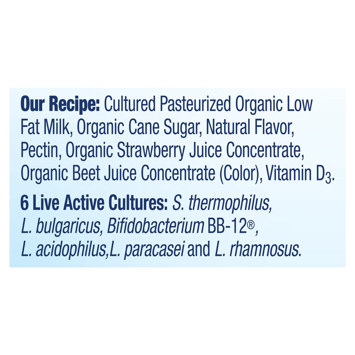 Cultured Pasteurized Organic Low Fat Milk, Organic Cane Sugar, Organic Strawberry Purée, Natural Flavor, Organic Beet Juice Concentrate (Color), Pectin, Vitamin D3