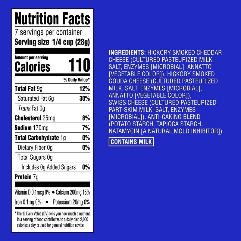 - Contains hickory-smoked cheddar, hickory-smoked Gouda and Swiss cheeses