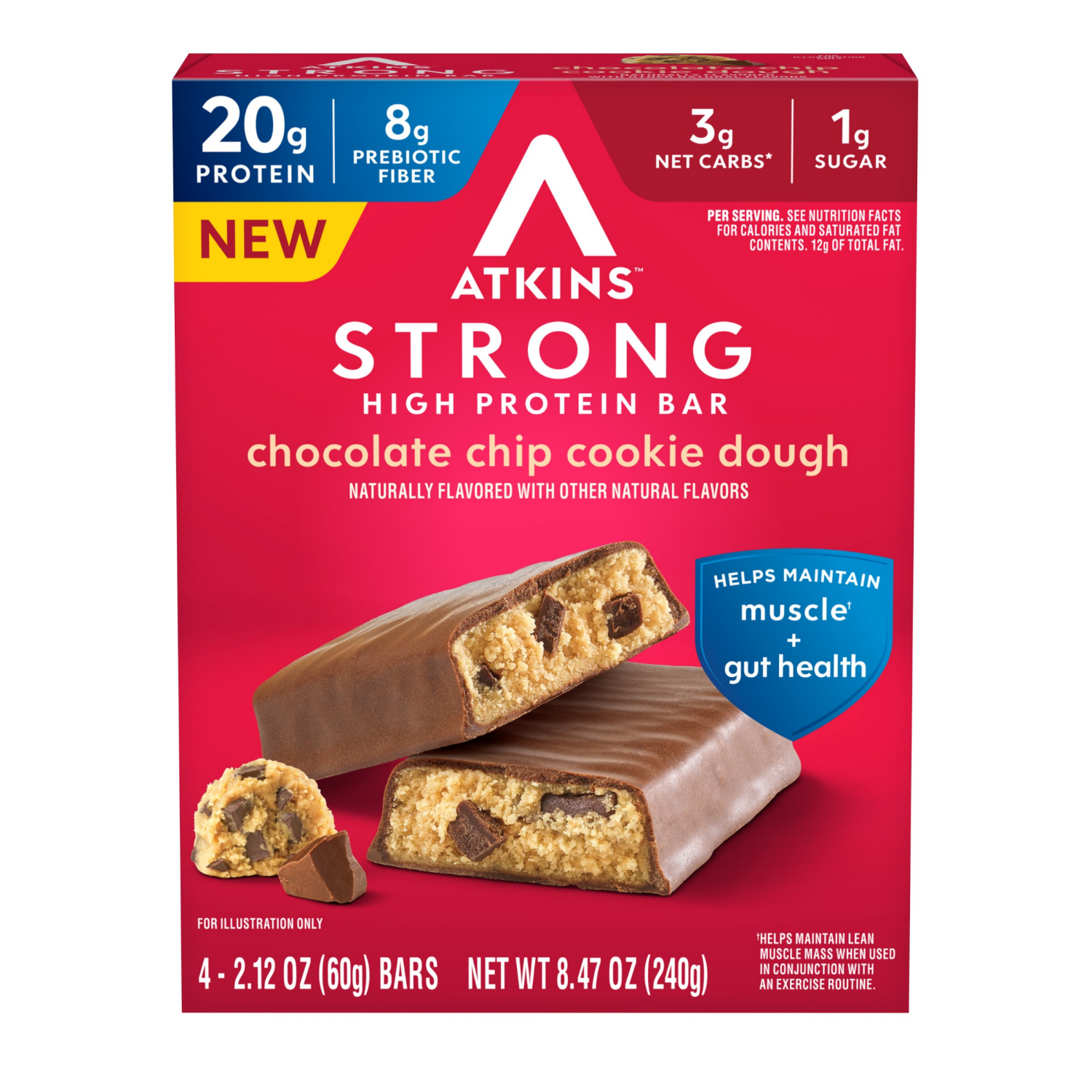 Treat yourself with our Chocolate Chip Cookie Dough flavored Atkins™ STRONG Bar. These are delicious and packed with 20g of protein and 8g of prebiotic fiber to help maintain lean muscle** and gut hea…