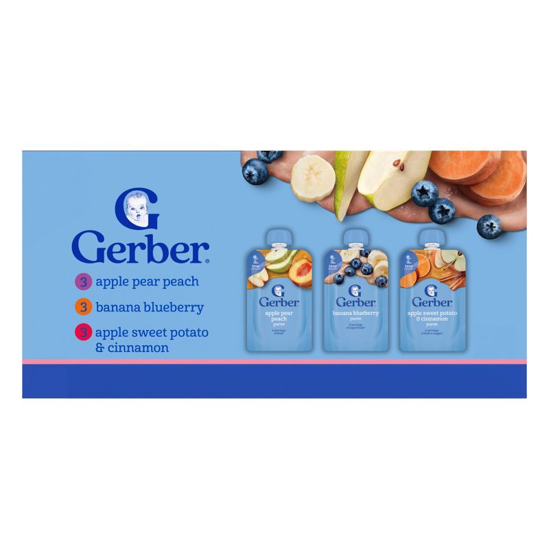- VARIETY OF PUREED FRUITS & VEGGIES: Our Gerber pouches variety pack comes with 3 puree favorites: apple pear peach, banana blueberry, and apple sweet potato cinnamon