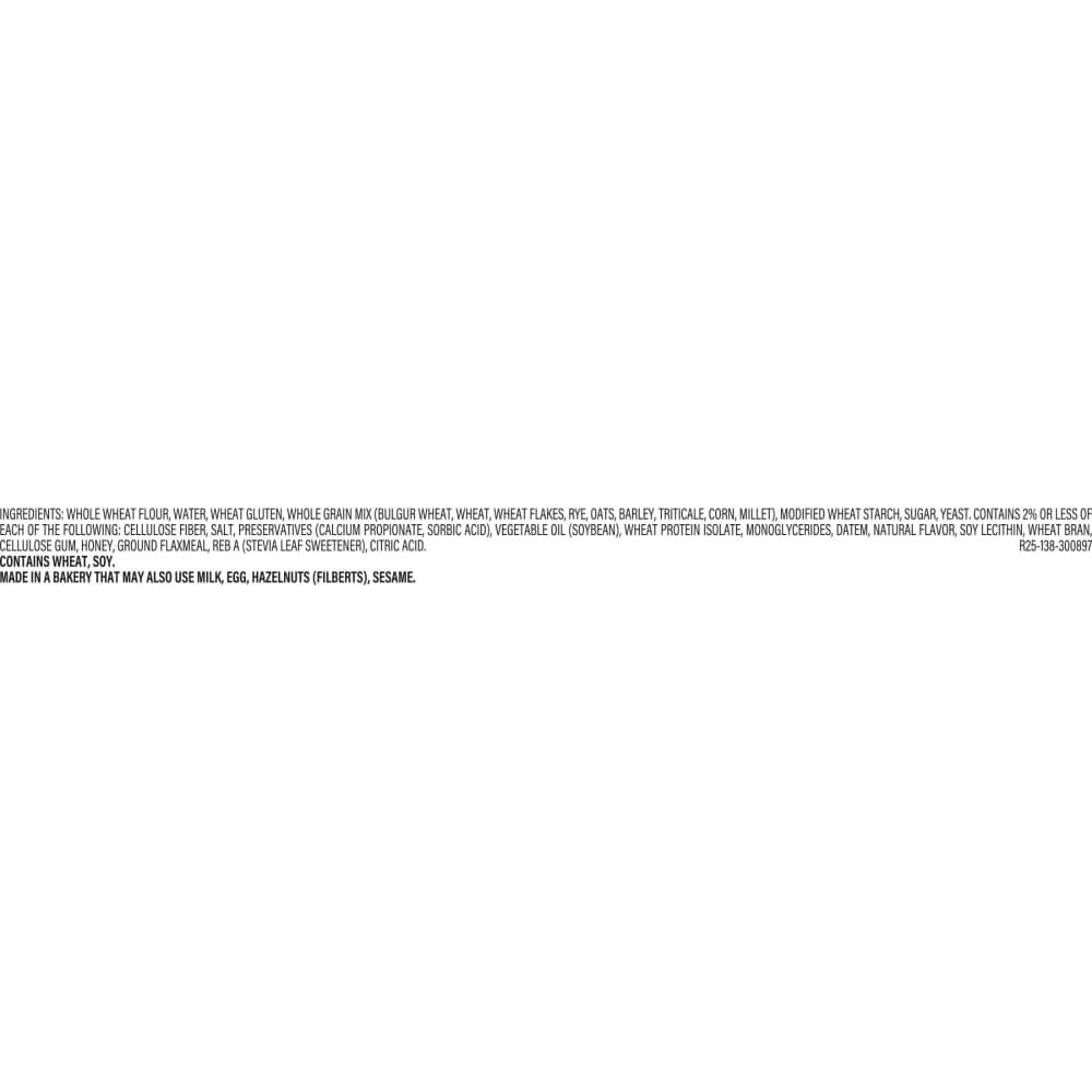 Whole Wheat Flour, Water, Wheat Gluten, Whole Grain Mix [Bulgur Wheat, Wheat, Rye, Oats, Barley, Triticale, Corn, Millet], Modified Wheat Starch, Sugar, Yeast, Cellulose Fiber, Salt, Preservatives [Ca…