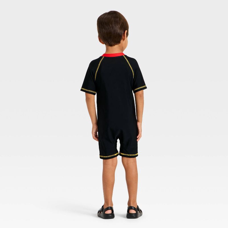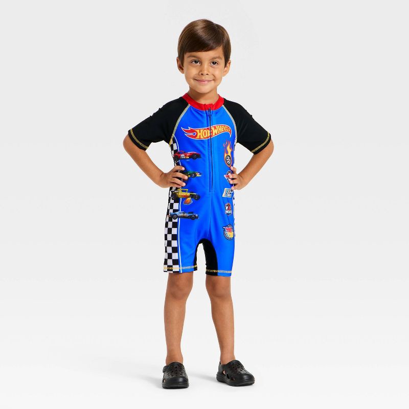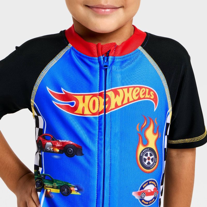 Your little one will be ready to race to the beach or pool in this Hot Wheels Racing Unisuit. Woven from polyester fabric, this unisuit swimsuit is designed in blue, black and red with assorted Hot Wh…