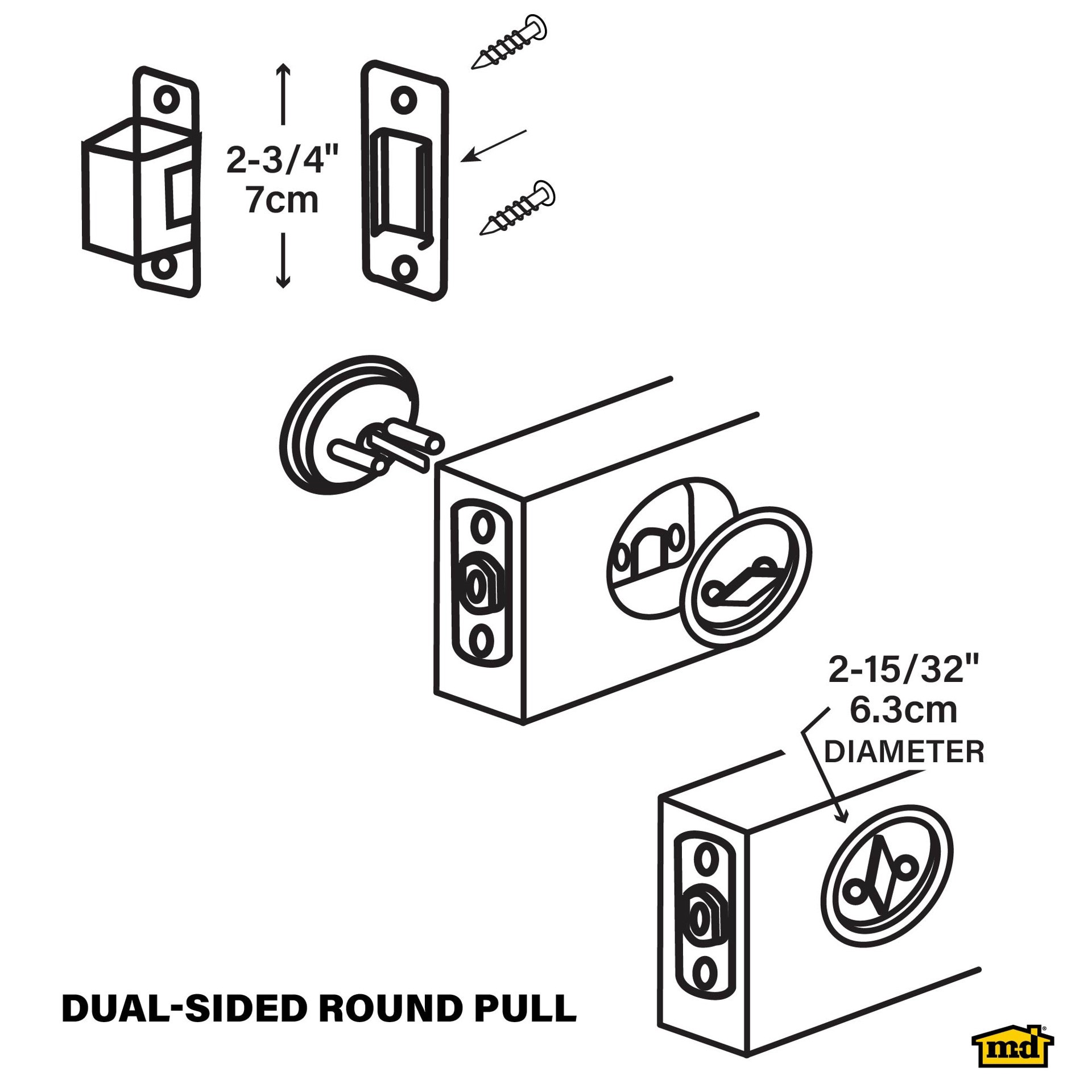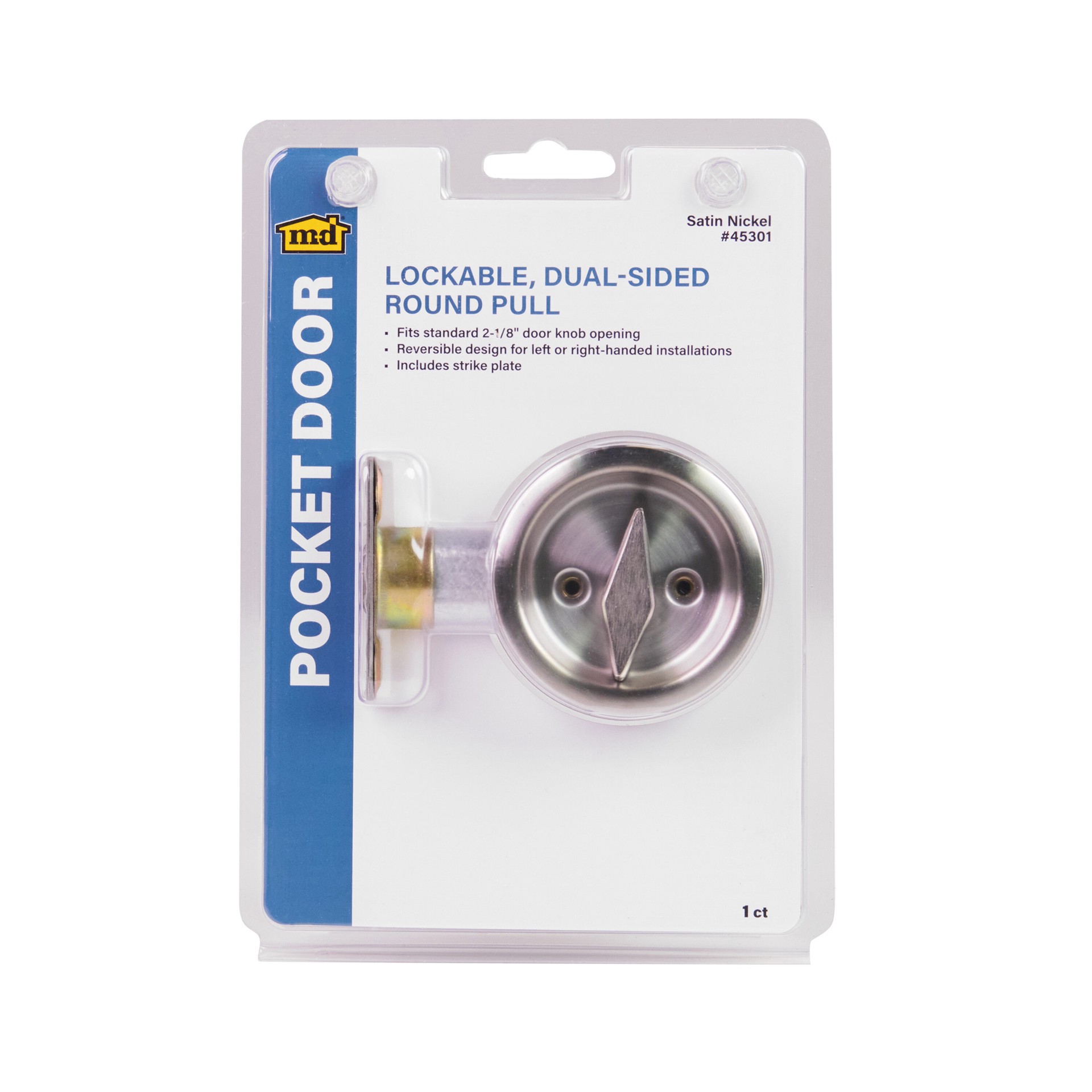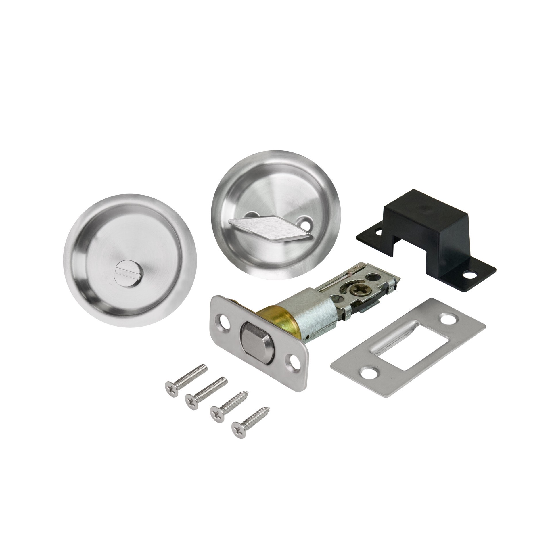 Round privacy pocket door pull. Steel construction. 2-1/8" wide fits in standard door knob hole. Steel. Satin Nickel finish. Use on interior pocket doors. Privacy lock. Installs with Phillips head scr…