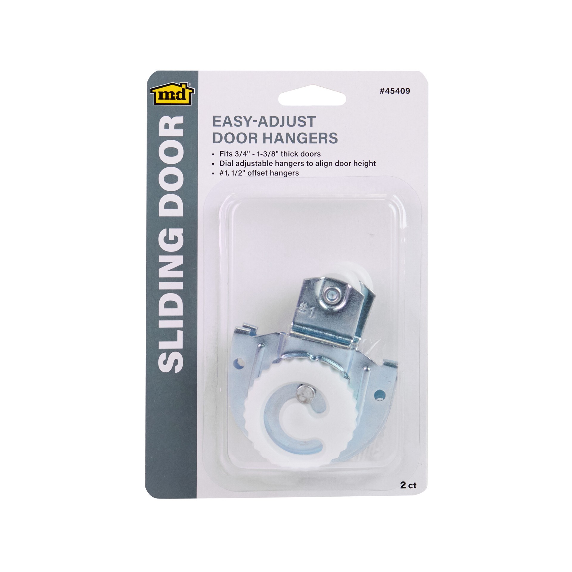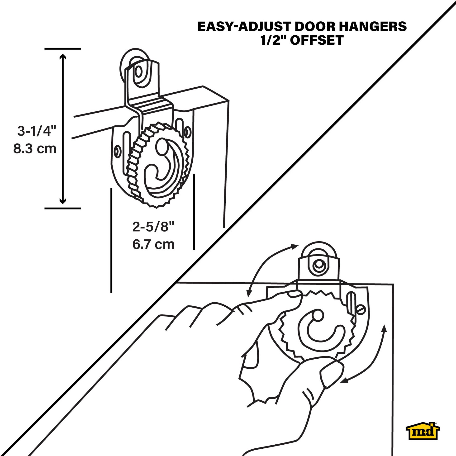 1/2" offset adjustable sliding door hangers for bypass sliding closet doors. Easy-adjust dial to align door height after installation. Fits on door 3/4" - 1-3/8" thick. Steel. Easy-adjust vertical dia…