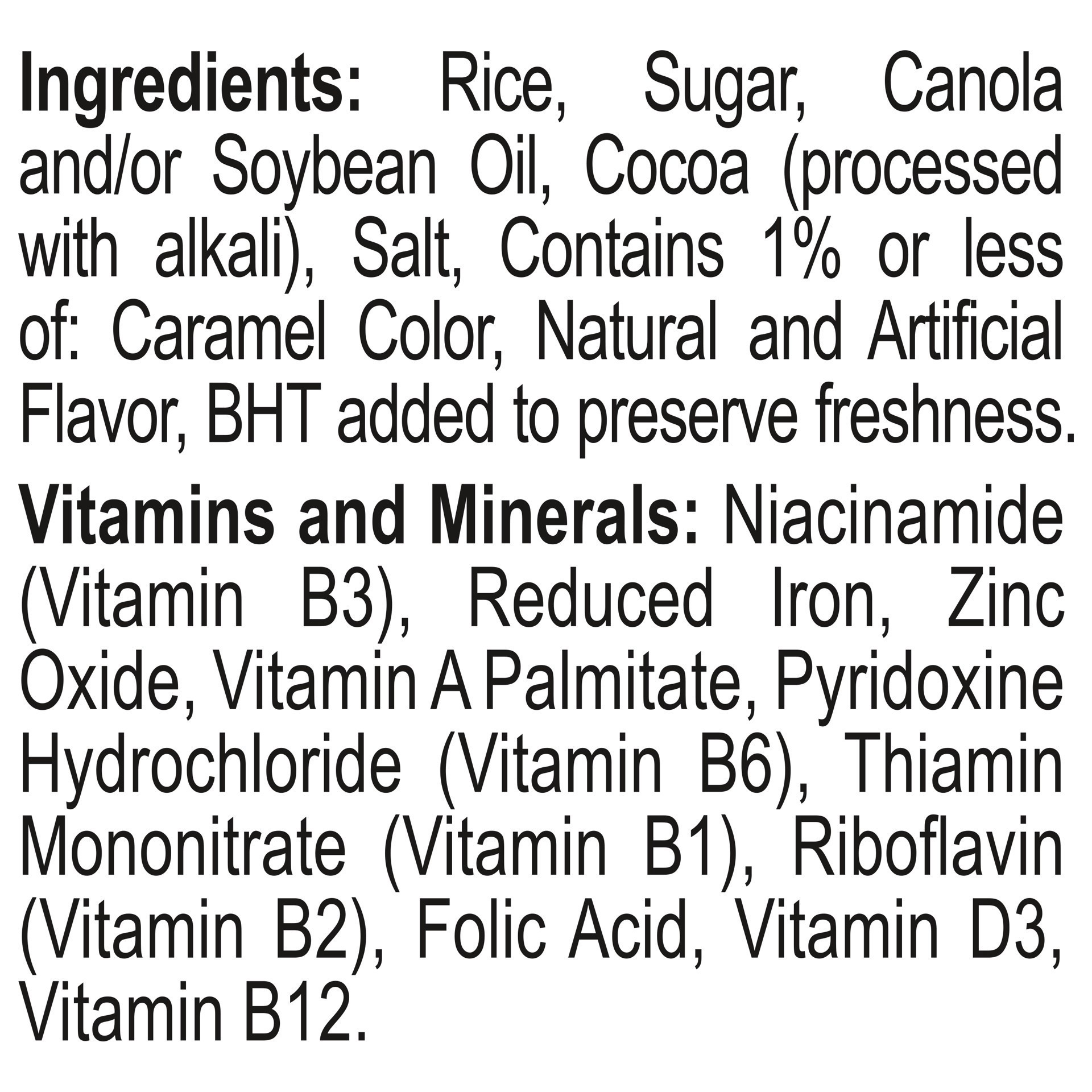 Rice, Sugar, Polydextrose (Source of Fiber), Hydrogenated Vegetable Oil (Coconut and Palm Kernel Oils), Cocoa (Processed with Alkali), Salt, Caramel Color, Artificial and Natural Flavor, BHA (to Help …