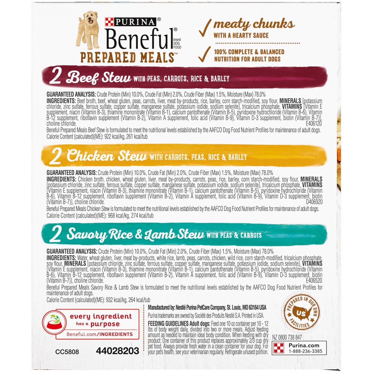Beef Stew with Peas, Carrots, Rice & Barley: Beef Broth, Beef, Wheat Gluten, Peas, Carrots, Liver, Meat By-Products, Rice, Barley, Corn Starch-Modified, Soy Flour, Minerals [Potassium Chloride, Zinc S…