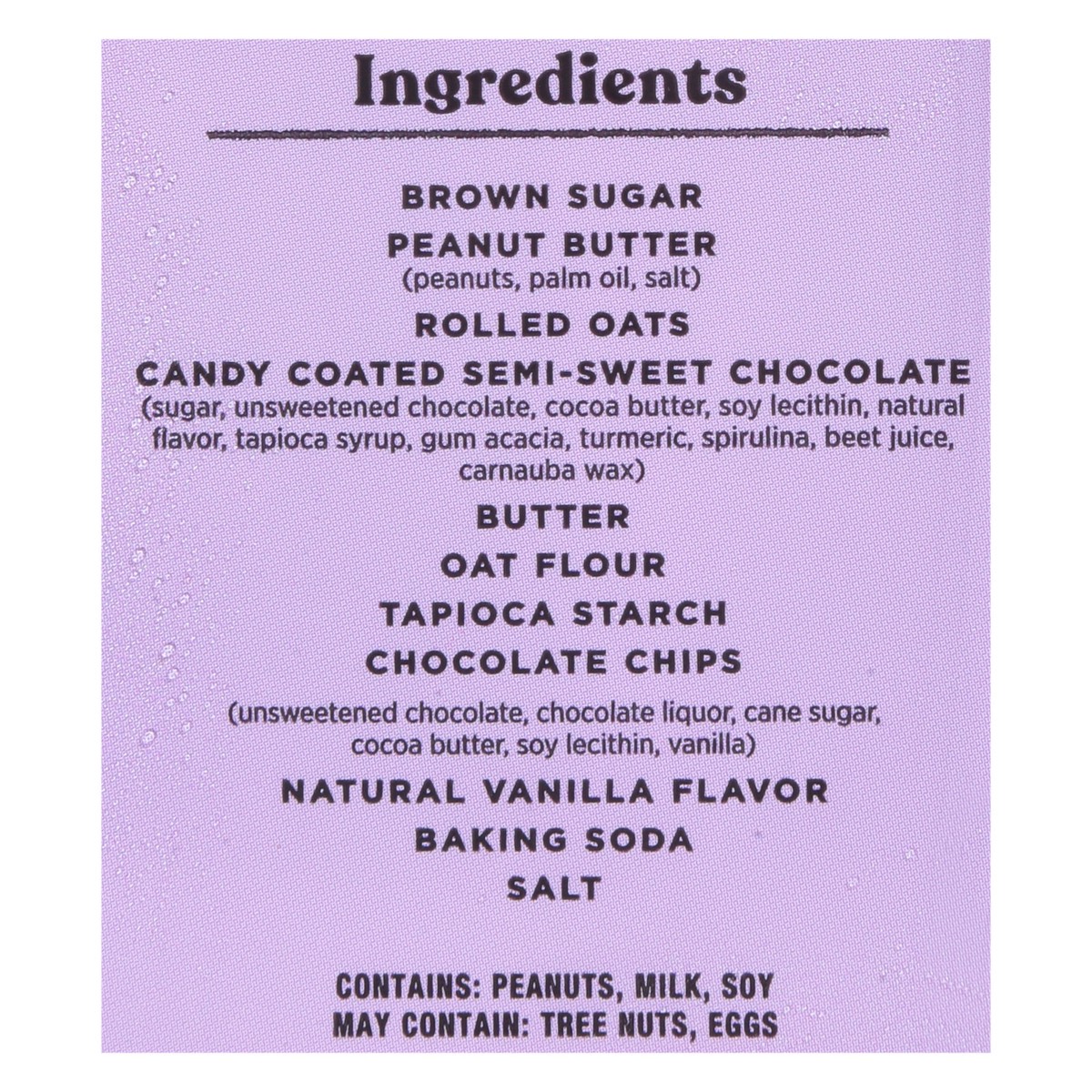 Peanut Buttersmartsugar (Brown Sugar, Chicory Root Fiber, Tapioca Syrup, Monkfruit Extract)Whole Grain Oatschocolate Chips + Chocolate Candies (Sugar, Unsweetened Chocolate , Cocoa Butter, Soy Lecithi…
