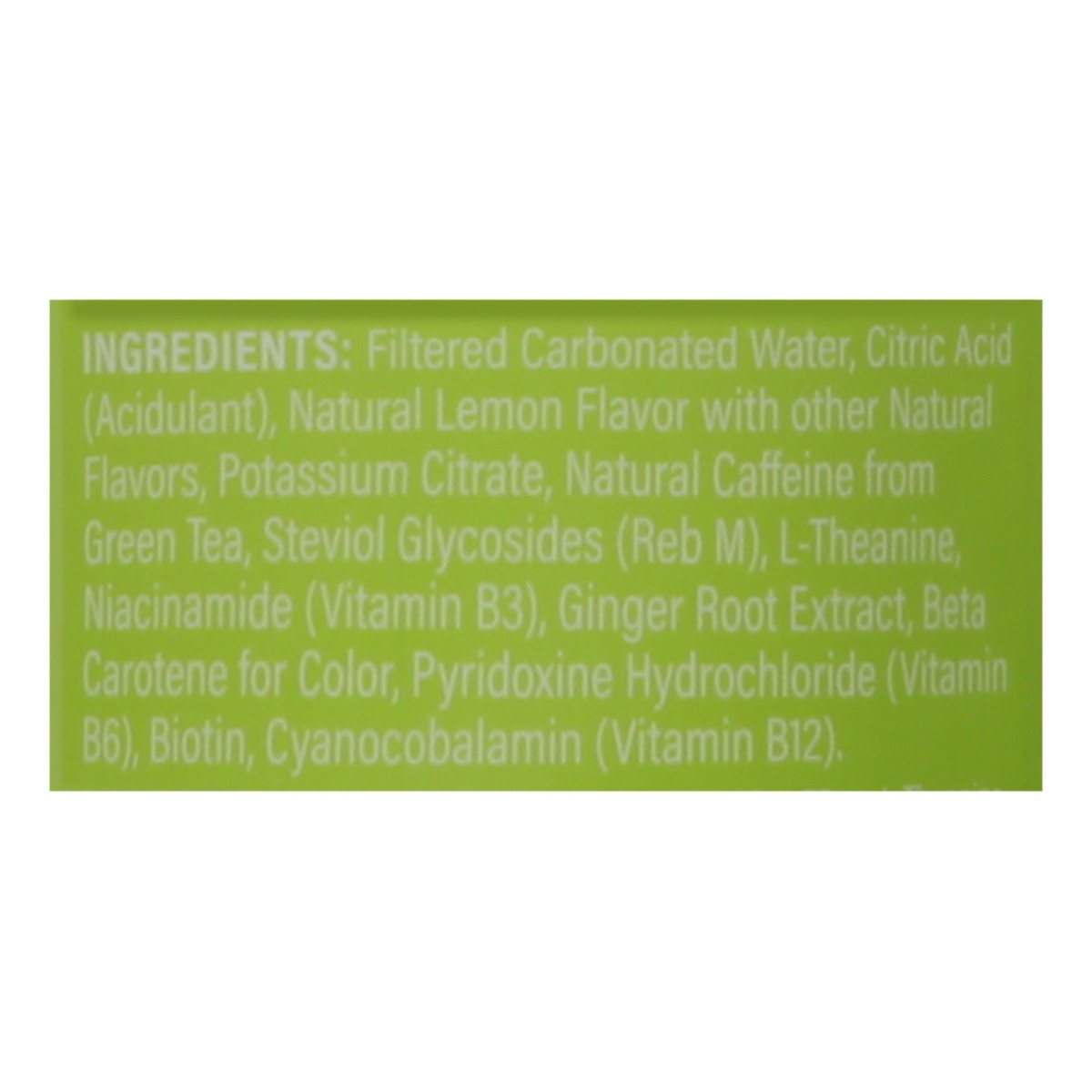 Filtered Carbonated Water, Citric Acid (Acidulant), Natural Lemon Flavor with Other Natural Flavors, Potassium Citrate, Natural Caffeine from Green Tea, Steviol Glycosides (Reb M), L-Theanine, Niacina…