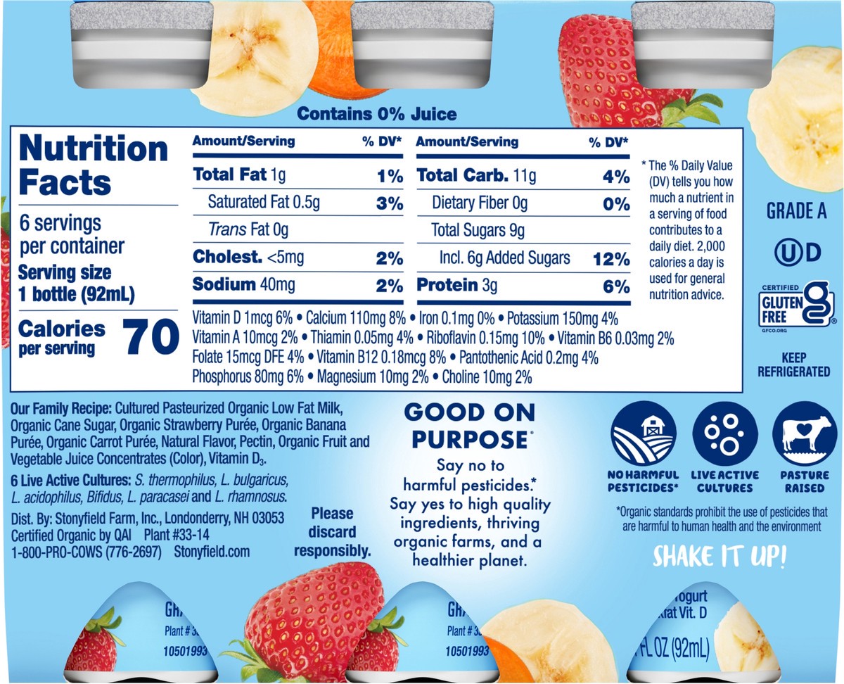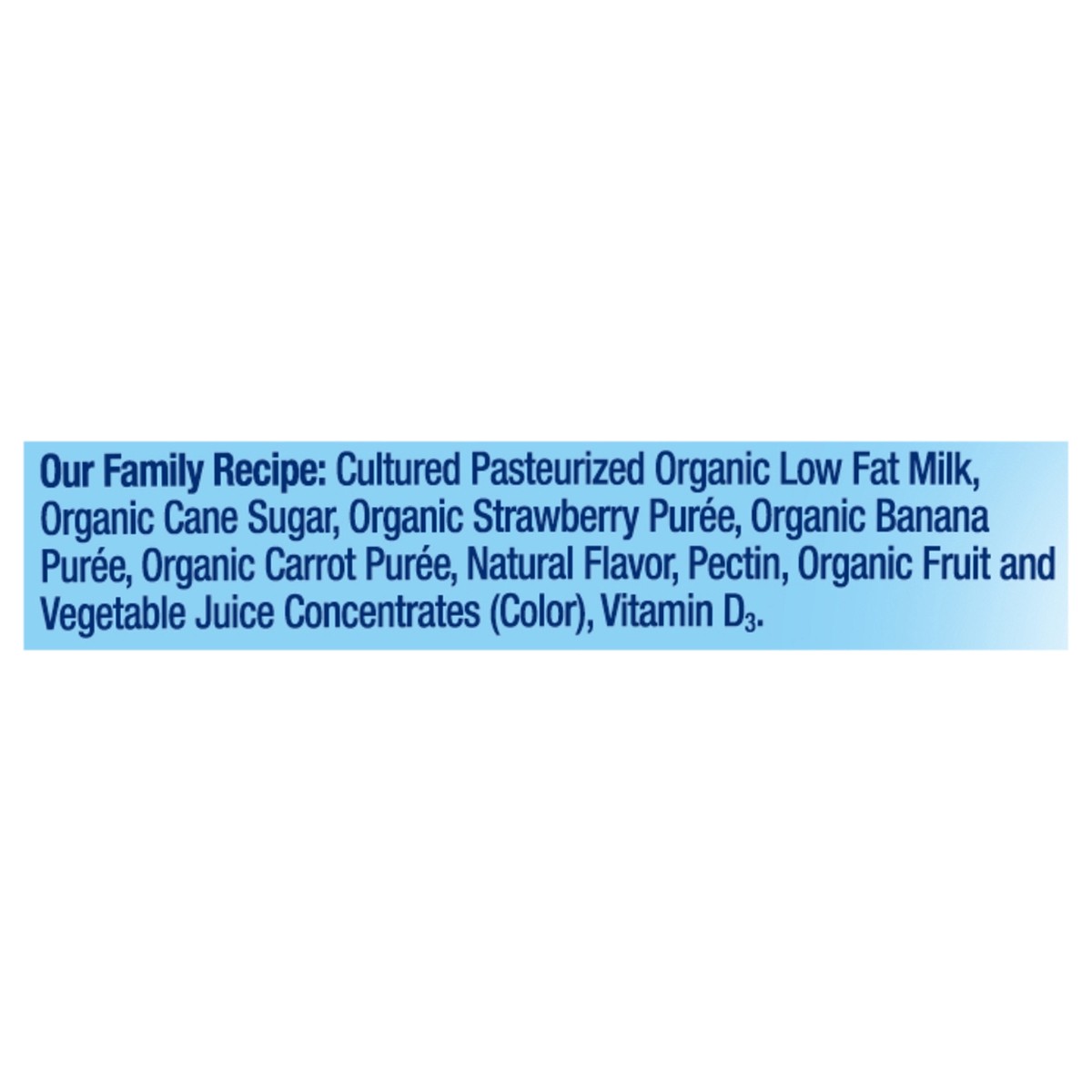 Our Family Recipe: Cultured Pasteurized Organic Low Fat Milk, Organic Cane Sugar, Organic Strawberry Puree, Organic Banana Puree, Organic Carrot Puree, Natural Flavor, Organic Tapioca Starch, Organic …