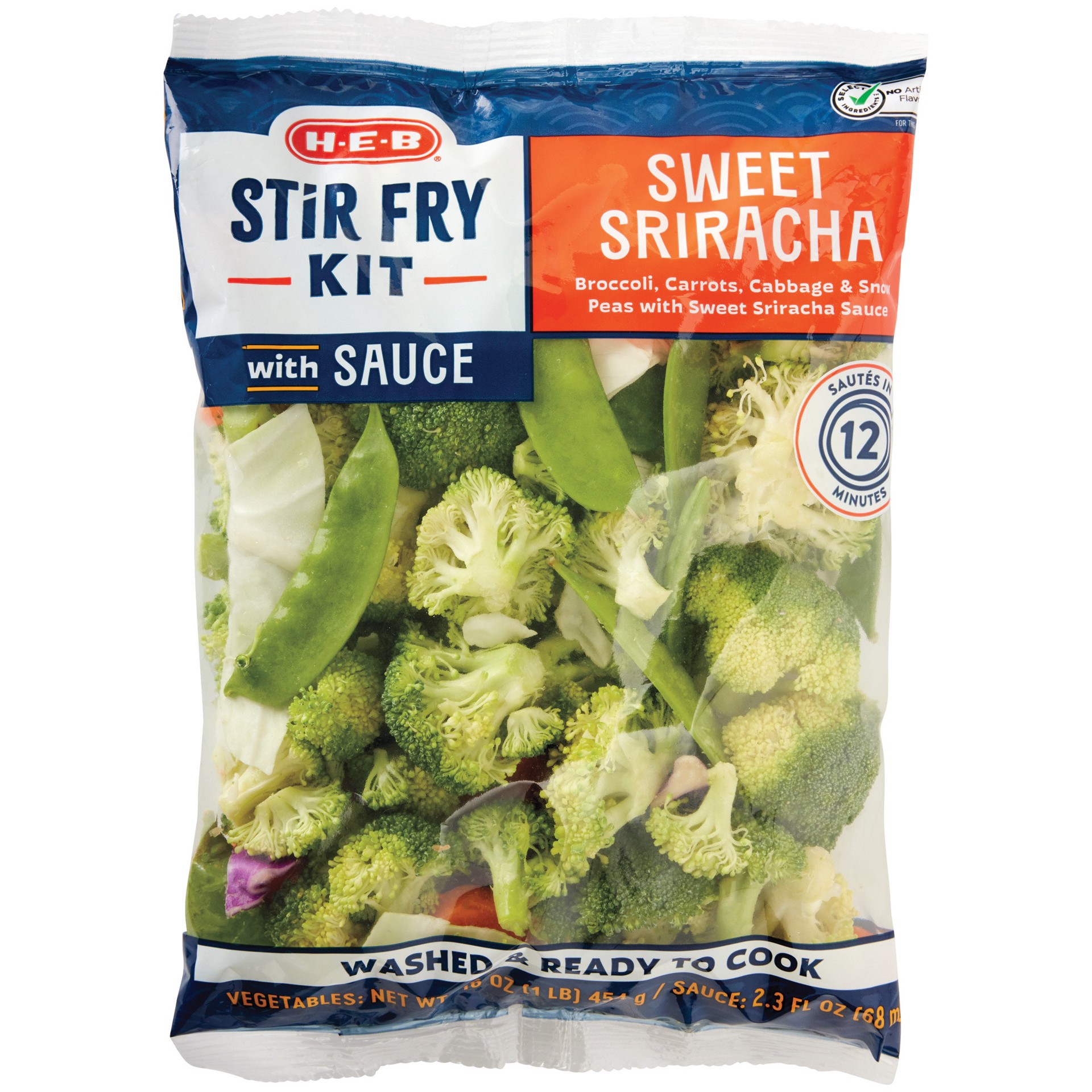 For a handy head start on dinner, pick up this H-E-B stir fry kit. It includes everything you need for making a Sweet Sriracha dish, like washed and ready to cook broccoli, carrots, cabbage and snow p…