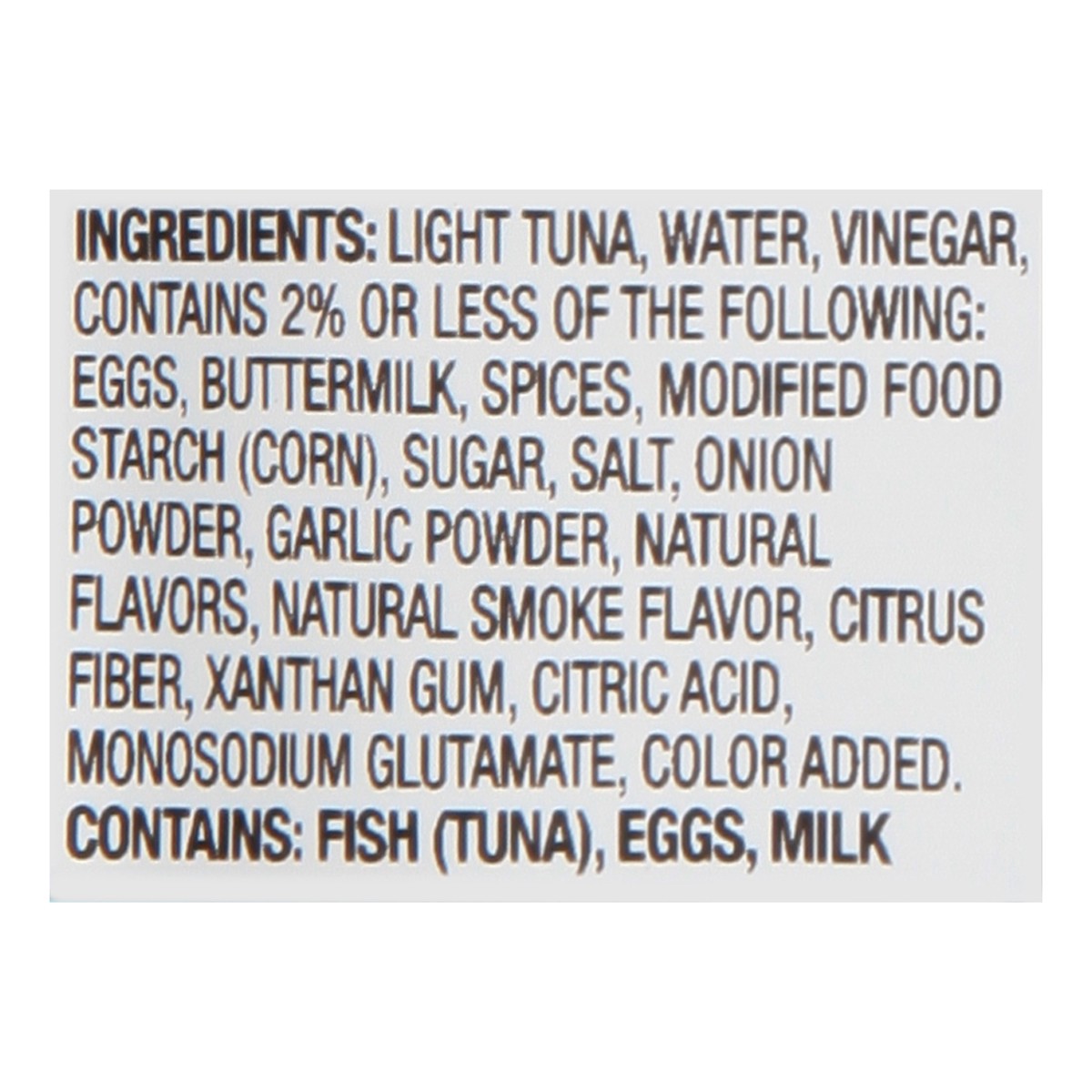Light Tuna, Water, Vinegar, Contains 2% Or Less Of The Following: Eggs, Buttermilk, Spices, Modified Food Starch (Corn), Sugar, Salt, Onion Powder, Garlic Powder, Natural Flavors, Natural Smoke Flavor…