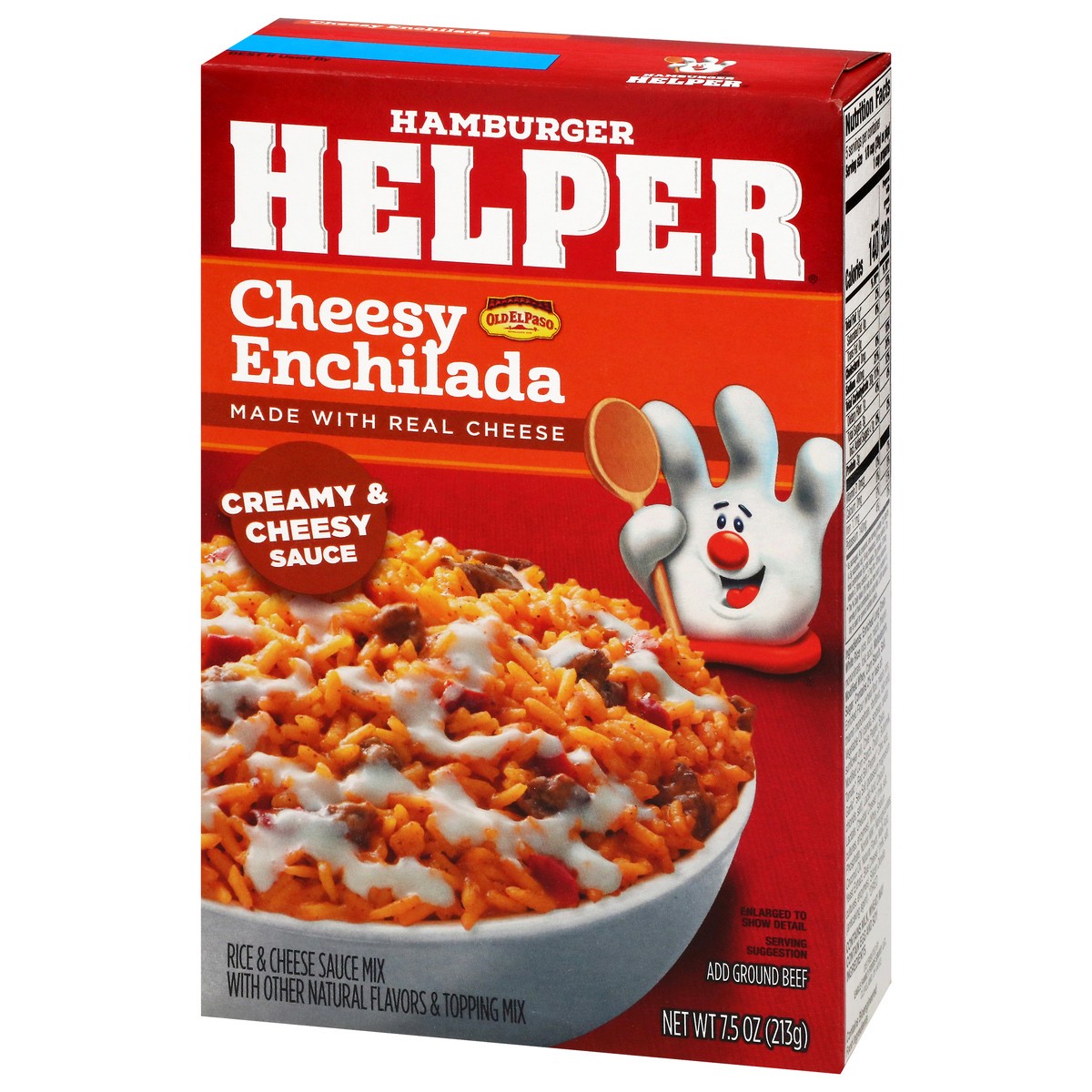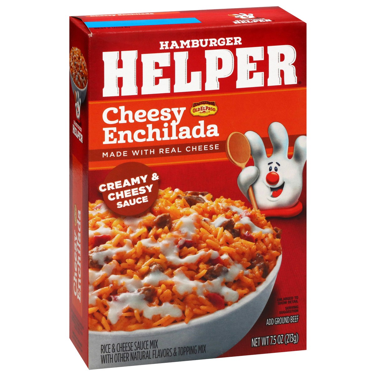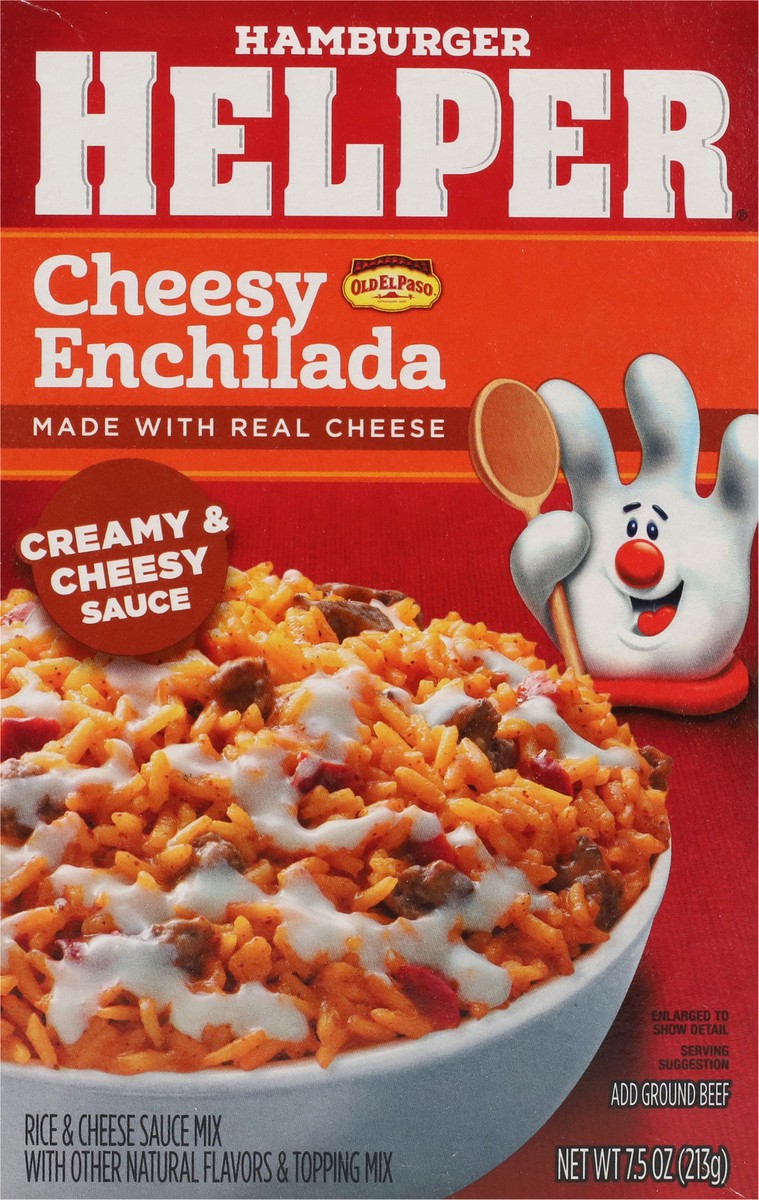 Hamburger Helper Cheesy Enchilada 7.5 oz Box. America's favorite Hamburger Helper is made with 100% REAL cheese and Mexican-style spices for the zesty taste you love most. Our products are made with N…