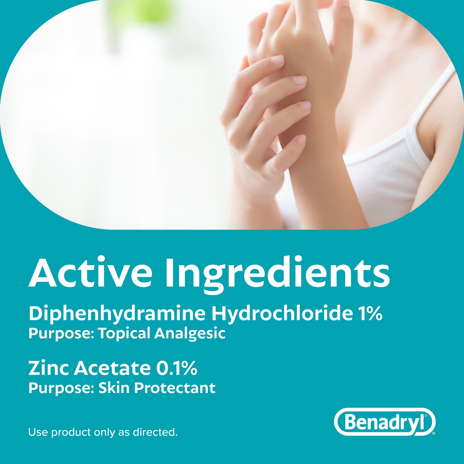 Active ingredients Diphenhydramine hydrochloride 1% Zinc acetate 0.1% Purpose Topical analgesic Skin protectant Inactive ingredients Cetyl alcohol, diazolidinyl urea, methylparaben, polyethylene glyco…