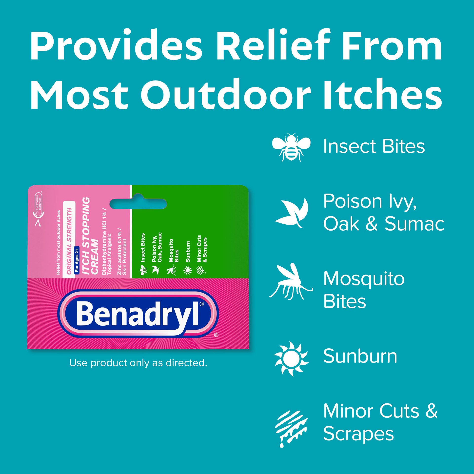 Get relief from minor pain and skin itching caused by most outdoor itches with Benadryl Original-Strength Itch Stopping Anti-Itch Cream. Made with 1% diphenhydramine hydrochloride, a topical analgesic…