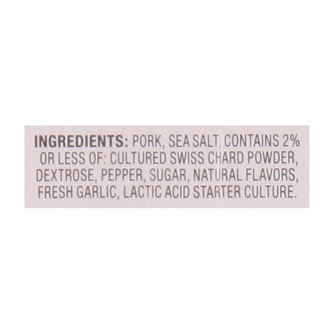 Pork, Sea Salt, Contains 2% or Less of: Cultured Swiss Chard Powder, Dextrose, Pepper, Sugar, Natural Flavors, Fresh Garlic, Lactic Acid Starter Culture.